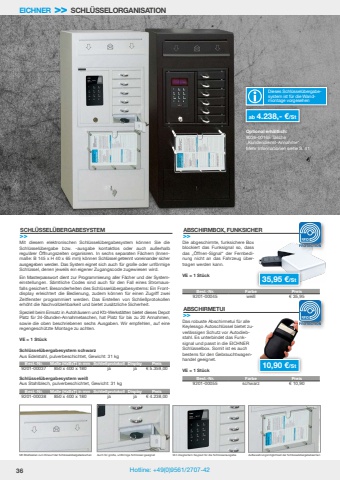 36 Hotline: +49(0)9561/2707-42Optional erh%u00e4ltlich:9036-00165 Tasche %u201eKundendienst-Annahme%u201cMehr Informationen siehe S. 41Mit diesem elektronischen Schl%u00fcssel%u00fcbergabesystem k%u00f6nnen Sie die Schl%u00fcssel%u00fcbergabe bzw. -ausgabe kontaktlos oder auch au%u00dferhalb regul%u00e4rer %u00d6ffnungszeiten organisiren. In sechs separaten F%u00e4chern (Innenma%u00dfe: B 145 x H 40 x 65 mm) k%u00f6nnen Schl%u00fcssel getrennt voneinander sicher ausgegeben werden. Das System eignet sich auch f%u00fcr gro%u00dfe oder unf%u00f6rmige Schl%u00fcssel, denen jeweils ein eigener Zugangscode zugewiesen wird.Ein Masterpasswort dient zur Programmierung aller F%u00e4cher und der Systemeinstellungen. S%u00e4mtliche Codes sind auch f%u00fcr den Fall eines Stromausfalls gesichert. Besonderheiten des Schl%u00fcssel%u00fcbergabesystems: Ein Frontdisplay erleichtert die Bedienung, zudem k%u00f6nnen f%u00fcr einen Zugriff zwei Zeitfenster programmiert werden. Das Erstellen von Schlie%u00dfprotokollen erh%u00f6ht die Nachvollziehbarkeit und bietet zus%u00e4tzliche Sicherheit.Speziell beim Einsatz in Autoh%u00e4usern und Kfz-Werkst%u00e4tten bietet dieses Depot Platz f%u00fcr 24-Stunden-Annahmetaschen, hat Platz f%u00fcr bis zu 20 Annahmen, sowie die oben beschriebenen sechs Ausgaben. Wir empfehlen, auf eine regengesch%u00fctzte Montage zu achten.VE = 1 St%u00fcckSCHL%u00dcSSEL%u00dcBERGABESYSTEM>>EICHNER >> SCHL%u00dcSSELORGANISATIONDieses Schl%u00fcssel%u00fcbergabesystem ist f%u00fcr die Wandmontage vorgesehenMit Briefkasten zum Einwurf der Schl%u00fcssel%u00fcbergabetaschen Auch f%u00fcr gro%u00dfe, unf%u00f6rmige Schl%u00fcssel geeignet Mit integriertem Keypad f%u00fcr die Schl%u00fcsselausgabe Aufbewahrungsm%u00f6glichkeit der Schl%u00fcssel%u00fcbergabetaschenab 4.238,- %u20ac/St Schl%u00fcssel%u00fcbergabesystem schwarzAus Edelstahl, pulverbeschichtet, Gewicht: 31 kgSchl%u00fcssel%u00fcbergabesystem wei%u00dfAus Stahlblech, pulverbeschichtet, Gewicht: 31 kgBest.-Nr. Ma%u00dfe (HxBxT) in mm Schlie%u00dfprotokoll Display Preis9201-00037 850 x 400 x 180 ja ja %u20ac 5.359,00Best.-Nr. Ma%u00dfe (HxBxT) in mm Schlie%u00dfprotokoll Display Preis9201-00038 850 x 400 x 180 ja ja %u20ac 4.238,0035,95 %u20ac/St Das robuste Abschirmetui f%u00fcr alle Keylessgo Autoschl%u00fcssel bietet zuverl%u00e4ssigen Schutz vor Autodiebstahl. Es unterbindet das Funksignal und passt in die EICHNER Schl%u00fcsselbox. Somit ist es auch bestens f%u00fcr den Gebrauchtwagenhandel geeignet.VE = 1 St%u00fcckABSCHIRMETUI>>Die abgeschirmte, funksichere Box blockiert das Funksignal so, dassdas %u201e%u00d6ffnen-Signal%u201c der Fernbedinung nicht an das Fahrzeug %u00fcbertragen werden kann.VE = 1 St%u00fcckABSCHIRMBOX, FUNKSICHER>>Best.-Nr. Farbe Preis9201-00045 wei%u00df %u20ac 35,95Best.-Nr. Farbe Preis 9201-00055 schwarz %u20ac 10,9010,90 %u20ac/St