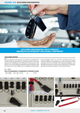 40 Hotline: +49(0)9561/2707-42EICHNER >> SCHL%u00dcSSELORGANISATIONMit den praktischen Schl%u00fcsselmappen aus robustem und pflegeleichtem Polyester gelingt die Organisation von Schl%u00fcsseln spielend. Sicher k%u00f6nnen sie an die enthaltenen Clips angebracht werden und sind schnell griffbereit. Die Schl%u00fcsselclips sind %u00fcbersichtlich nebeneinander angeordnet und mit einem gro%u00dfz%u00fcgigen Beschriftungsfeld ausgestattet. Nach der Entnahme kann der jeweilige Clip am mitgelieferten Schl%u00fcsselband (Lanyard) befestigt werden. So wird einem ungewollten Verlust vorgebeugt. Die Mappen sind wahlweise f%u00fcr 14 oder 28 Schl%u00fcssel erh%u00e4ltlich und werden mit einem umlaufenden Rei%u00dfverschluss geschlossen. In der XL-Mappe finden auch zwei Stifte in den integrierten Stifthaltern Platz. Beschriftungsvorlagen f%u00fcr die Kennzeichnung der Mappe und die Schl%u00fcsselpositionen sind als Downloadlink im Lieferumfang enthalten.SCHL%u00dcSSELMAPPEN>>Best.-Nr. Ma%u00dfe Clips Preis9201-00034 220 x 275 x 40 mm 14 47,40 %u20ac9201-00035 275 x 385 x 40 mm 28 71,10 %u20acSCHL%u00dcSSELORGANISATION LEICHT GEMACHT.%u00dcBERSICHTLICH VERWAHRT UND SCHNELL GRIFFBEREIT.VE = 1 St%u00fcck