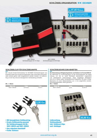 www.eichner-org.de 41SCHL%u00dcSSELORGANISATION << EICHNERDer robuste Ersatz-Schl%u00fcsselclip f%u00fcr EICHNER Schl%u00fcsselmappen aus Polyester bietet eine Austauschm%u00f6glichkeit, falls vorhandene Schl%u00fcsselclips verloren gehen oder ausgetauscht werden m%u00fcssen. Im Lieferumfang ist der Clip inklusive beweglichem Schl%u00fcsselring enthalten.Zur Verwendung in Ringbuchsystemen und Ordnern im Format DIN A4Als Alternative zur Schl%u00fcsselmappe ist das Schl%u00fcsselboard die ideale L%u00f6sung, um bis zu zw%u00f6lf Schl%u00fcssel %u00fcbersichtlich angeordnet und platzsparend unterzubringen. Dank langlebiger Metall%u00f6sen kann es in nahezu jeden handels%u00fcblichen Ringordner mit einer 2-RingMechanik mit einer Materialst%u00e4rke von 4 mm abgeheftet werden. Schl%u00fcsselorganisation leicht gemacht! SCHL%u00dcSSELCLIP F%u00dcR SCHL%u00dcSSELMAPPE>>SCHL%u00dcSSELBOARD ZUM ABHEFTEN>>Best.-Nr. Farbe Preis9201-00039 schwarz 2,50 %u20acBest.-Nr. Farbe Preis9201-00040 grau 30,90 %u20acVE = 1 St%u00fcck VE = 1 St%u00fcckM%u00f6glichkeit zur Individualisierung durch eine transparente Etikettentasche der Vorderseite. 9201-00034 Schl%u00fcsselmappe mit 14 Clips9201-00035 Schl%u00fcsselmappe mit 28 Clipsab 47,40 %u20ac/St%u00fcckIdeal f%u00fcr die Organisation und Aufbewahrung einer gro%u00dfen Anzahl an Schl%u00fcsseln.%u2022 Mit beweglichem Schl%u00fcsselring%u2022 Ersatz-Schl%u00fcsselclip passend f%u00fcr Schl%u00fcsselmappen Art.Nr.: 9201-00035 und 9201-00034%u2022 Aus robustem Kunststoff%u2022 Farbe: SchwarzLieferumfang: Schl%u00fcsselboard inkl. Schl%u00fcssel-Clips und -Anh%u00e4nger30,90 %u20ac/St 2,50 %u20ac/St