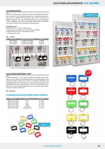 www.eichner-org.de 45SCHL%u00dcSSELORGANISATION << EICHNERSchl%u00fcssel professionell aufbewahren! Mit den EICHNER Schl%u00fcsseltafeln verwalten Sie Schl%u00fcssel %u00fcbersichtlich in gesicherten R%u00e4umen. Sie sind zur direkten Wandmontage oder auch zum Einbau in M%u00f6beln geeignet. F%u00fcr die schnelle Montage sind die Bohrungen bereits vorgesehen. Die h%u00f6henverstellbaren Hakenleisten erm%u00f6glichen eine auf Ihre Bed%u00fcrfnisse anpassbare Aufbewahrung.Spezifikationen:%u2022 Erh%u00e4ltlich mit 3, 4 oder 5 Hakenleisten%u2022 Hakenleisten im Raster von 14mm h%u00f6henverstellbar%u2022 Hakenabstand 30 mm, Hakenl%u00e4nge 15 mm%u2022 Lichtgrau RAL 7035VE = 1 St%u00fcckSCHL%u00dcSSELTAFEL>>Best.-Nr. Anzahl Leisten/Haken Preis/VE9201-00052 3 Leisten/21 Haken %u20ac 32,609201-00053 4 Leisten/32 Haken %u20ac 48,509201-00054 5 Leisten/50 Haken %u20ac 65,20Schl%u00fcsselanh%u00e4nger %u201eTiny%u201c inklusive praktischem Ring. Bestens geeignet f%u00fcr alle Tresore, Schl%u00fcsselschr%u00e4nke oder Schl%u00fcsseltafeln. Die kompakte Gr%u00f6%u00dfe schafft mehr Raum f%u00fcr zus%u00e4tzliche Schl%u00fcssel. Die Anh%u00e4nger lassen sich problemlos mit einer internen Vorgangs- oder Identifikationsnummer peronalisieren. Durch die Farbcodierung erreichen Sie eine schnelle Kategorisierung und erleichtern das Auffinden des korrekten Schl%u00fcssels.VE = 50 St%u00fcckSCHL%u00dcSSELANH%u00c4NGER %u201eTINY%u201c>>Best.-Nr. Farbe Preis/VE9219-01414-010 blau %u20ac 11,909219-01414-020 rot %u20ac 11,909219-01414-030 gr%u00fcn %u20ac 11,909219-01414-040 gelb %u20ac 11,909219-01414-100 schwarz %u20ac 11,909219-01414-990 farbig sortiert %u20ac 11,90ab 32,60 %u20ac/St In einzelnen Farben oder farblich sortiert erh%u00e4ltlich.NEUSchnell h%u00f6henverstellbare Leisten im Raster von 14 mm 11,90 %u20ac/St