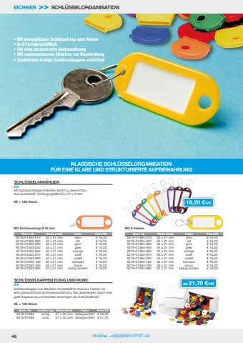 46 Hotline: +49(0)9561/2707-42EICHNER >> SCHL%u00dcSSELORGANISATIONMit austauschbaren Etiketten leicht zu beschriften. Aus Kunststoff. Anh%u00e4ngergr%u00f6%u00dfe 52 x 21 x 3 mmVE = 100 St%u00fcckSchl%u00fcsselkappe aus flexiblem Kunststoff in diversen Farben f%u00fcr eine %u00fcbersichtliche Schl%u00fcsselzuordnung. Sie %u00fcberzeugen durch eine gute Anpassung und leichtes Anbringen am Schl%u00fcsselkopf.VE = 100 St%u00fcckSCHL%u00dcSSELANH%u00c4NGER>>SCHL%u00dcSSELKAPPEN ECKIG UND RUND>>Best.-Nr. Ma%u00dfe (HxB) Farbe Preis/VE9219-01383-010 52 x 21 mm blau %u20ac 16,209219-01383-020 52 x 21 mm rot %u20ac 16,209219-01383-030 52 x 21 mm gr%u00fcn %u20ac 16,209219-01383-040 52 x 21 mm gelb %u20ac 16,209219-01383-060 52 x 21 mm orange %u20ac 16,209219-01383-070 52 x 21 mm wei%u00df %u20ac 16,209219-01383-090 52 x 21 mm violett %u20ac 16,209219-01383-100 52 x 21 mm schwarz %u20ac 16,209219-01383-160 52 x 21 mm braun %u20ac 16,209219-01383-990 52 x 21 mm farbig sortiert %u20ac 16,20Best.-Nr. Ausf%u00fchrung Ma%u00dfe (HxB) Farbe Preis/VE9219-01385 eckig 27 x 30 mm farbig sortiert %u20ac 26,309219-01386 rund 27 x 30 mm farbig sortiert %u20ac 21,70Best.-Nr. Ma%u00dfe (HxB) Farbe Preis/VE9219-01384-010 52 x 21 mm blau %u20ac 16,209219-01384-020 52 x 21 mm rot %u20ac 16,209219-01384-030 52 x 21 mm gr%u00fcn %u20ac 16,209219-01384-040 52 x 21 mm gelb %u20ac 16,209219-01384-060 52 x 21 mm orange %u20ac 16,209219-01384-070 52 x 21 mm wei%u00df %u20ac 16,209219-01384-090 52 x 21 mm violett %u20ac 16,209219-01384-100 52 x 21 mm schwarz %u20ac 16,209219-01384-160 52 x 21 mm braun %u20ac 16,209219-01384-990 52 x 21 mm farbig sortiert %u20ac 16,20Mit Schl%u00fcsselring %u00d818 mm Mit S-Haken16,20 %u20ac/VEab 21,70 %u20ac/VE%u2022 Mit beweglichem Schl%u00fcsselring oder Haken%u2022 In 9 Farben erh%u00e4ltlich%u2022 F%u00fcr eine strukturierte Aufbewahrung%u2022 Mit austauschbaren Etiketten zur Beschriftung%u2022 Zus%u00e4tzliche farbige Schl%u00fcsselkappen erh%u00e4ltlich KLASSISCHE SCHL%u00dcSSELORGANISATIONF%u00dcR EINE KLARE UND STRUKTURIERTE AUFBEWAHRUNG