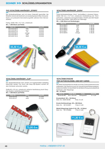 48 Hotline: +49(0)9561/2707-42Der Schlaufenanh%u00e4nger wird mit einem Folienstift beschriftet. Die Etiketten sind einzeln perforiert und zweiseitig beschriftbar. Eine praktische und preiswerte Kennzeichnungshilfe w%u00e4hrend Ihrer Servicearbeiten.Farbig, Gr%u00f6%u00dfe 160 x 12,7 mm, unbedrucktVE = 1.000 St%u00fcck (auf Rolle)Tyvek-Schl%u00fcsselanh%u00e4nger %u201eDura%u201c, hochrei%u00dffest, in diversen Farben, Gr%u00f6%u00dfe 160 mm x 12,7 mm, unbedruckt, Endlosfaltung inkl. Trennperforation, wahlweise mit Kugelschreiber, Filzstift oder EDV-Nadeldrucker beschriftbar, 1000 St%u00fcck pro FaltenlageVE = 1.000 St%u00fcck auf EndlosbogenDer Schl%u00fcsselanh%u00e4nger kann einfach mit Kugelschreiber beidseitig beschriftet werden und durch das Easy-Clip-System schnell mit dem Schl%u00fcssel verbunden werden.Gr%u00f6%u00dfe 85 x 22 mm, unbedruckt, einfache Handhabung durch EasyClip-System, beidseitig beschreibbarVE = 1.000 St%u00fcck (auf Rolle)Mit dieser Schl%u00fcsseltasche werden auch Key Cards problemlos sicher aufbewahrt. Die Tasche ist auch f%u00fcr normale Autoschl%u00fcssel geeignet.Optional erh%u00e4ltlich ist das Etikett f%u00fcr die Beschriftung sowie passende Schl%u00fcssel- oder Klappringe.VE = 10 St%u00fcckErsatzetikett, VE = 100 St%u00fcckBest.-Nr.: 0508-00498 Preis: %u20ac 4,20Ersatz-Schl%u00fcsselringe, VE = 200 St%u00fcckBest.-Nr.: 9219-00321 Preis: %u20ac 4,00Metall-Klappringe (siehe S.18), VE = 10 St%u00fcckBest.-Nr.: 9015-00686 Preis: %u20ac 4,60ErsatzetikettEICHNER >> SCHL%u00dcSSELORGANISATIONPVC-SCHL%u00dcSSELANH%u00c4NGER %u201eSTRIPE%u201c>>SCHL%u00dcSSELANH%u00c4NGER %u201eCLIP%u201c>>SCHL%u00dcSSELANH%u00c4NGER %u201eDURA%u201c>>SCHL%u00dcSSELTASCHE F%u00dcR AUTOSCHL%u00dcSSEL UND KEY CARDS>>Best.-Nr. Farbe Preis/VE9219-00105-N blau %u20ac 35,509219-00106-N gr%u00fcn %u20ac 35,509219-00107-N rot %u20ac 35,509219-00108-N orange %u20ac 35,509219-00109-N gelb %u20ac 35,509219-00110-N wei%u00df %u20ac 35,50Best.-Nr. Farbe Preis/VE9219-00146 rot %u20ac 73,009219-00147 wei%u00df %u20ac 73,00Best.-Nr. Gr%u00f6%u00dfe (BxH) Farbe Preis/VE9218-04106 83 x 130 mm transparent %u20ac 11,30Best.-Nr. Farbe Preis/VE9219-00813 wei%u00df %u20ac 48,309219-00814 blau %u20ac 48,309219-00815 rot %u20ac 48,309219-00816 gr%u00fcn %u20ac 48,309219-00817 gelb %u20ac 48,309219-00818 orange %u20ac 48,3035,50 %u20ac/VE 48,30 %u20ac/VE73,00 %u20ac/VE11,30 %u20ac/VE