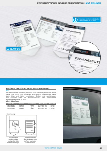 www.eichner-org.de 51PREISAUSZEICHNUNG UND PR%u00c4SENTATION << EICHNERWie Preisblatthalter Standard, jedoch mit 4 cm individuell gestaltbarer Werbefl%u00e4che. Aus bruch- und sto%u00dffestem Polycarbonat, unempfindlich gegen Licht, Hitze und K%u00e4lte, verschiedene Gr%u00f6%u00dfen und Ausrichtungen, zum Einsetzen hinter die Windschutzscheibe oder Seitenscheibe.Mindestbestellmenge: 25 St%u00fcckVE = 5 St%u00fcck/PackPREISBLATTHALTER MIT INDIVIDUELLER WERBUNG>>Die Klarsichtfolie anheben und das jeweilige Blatt hinter die Klarsichtfolie legen.Der Preissblatthalter l%u00e4sst sich bequem hinter die Front- bzw. Seitenscheibe klemmen.Handhabung:Best.-Nr. Format Ausrichtung Ma%u00dfe (B x L) Preis /St 9219-01001 DIN A4 hoch 216 x 418 mm %u20ac 16,109219-01002 DIN A4 quer 306 x 327 mm %u20ac 16,109219-01003 DIN A3 quer 426 x 415 mm %u20ac 23,00ab 16,10 %u20ac/StBedruckt mit Ihrem individuellen Design bereits ab 25 St%u00fcck.