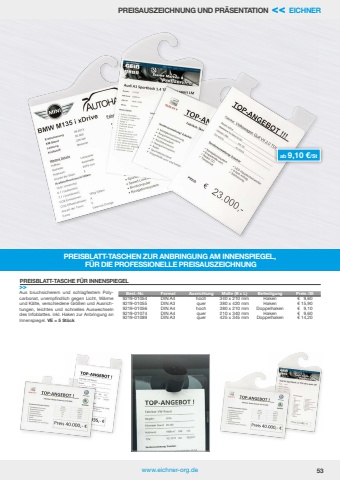 www.eichner-org.de 53PREISAUSZEICHNUNG UND PR%u00c4SENTATION << EICHNERPREISBLATT-TASCHEN ZUR ANBRINGUNG AM INNENSPIEGEL, F%u00dcR DIE PROFESSIONELLE PREISAUSZEICHNUNGab 9,10 %u20ac/StAus bruchsicherem und schlagfestem Polycarbonat, unempfindlich gegen Licht, W%u00e4rme und K%u00e4lte, verschiedene Gr%u00f6%u00dfen und Ausrichtungen, leichtes und schnelles Auswechseln des Infoblattes. inkl. Haken zur Anbringung an Innenspiegel. VE = 5 St%u00fcckPREISBLATT-TASCHE F%u00dcR INNENSPIEGEL>>Best.-Nr. Format Ausrichtung Ma%u00dfe (B x L) Befestigung Preis /St 9219-01054 DIN A4 hoch 340 x 210 mm Haken %u20ac 9,609219-01055 DIN A3 quer 380 x 420 mm Haken %u20ac 15,909219-01056 DIN A4 hoch 380 x 210 mm Doppelhaken %u20ac 9,109219-01074 DIN A4 quer 210 x 340 mm Haken %u20ac 9,609219-01089 DIN A3 quer 425 x 345 mm Doppelhaken %u20ac 14,20