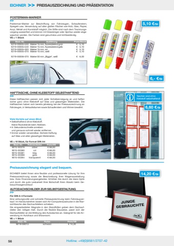56 Hotline: +49(0)9561/2707-42EICHNER >> PREISAUSZEICHNUNG UND PR%u00c4SENTATIONPOSTERMAN-MARKER >>Best.-Nr. Ausf%u00fchrung Preis/St%u00fcck 9219-00005-530 Marker 15 mm, fluoreszierend gr%u00fcn %u20ac 5,109219-00005-540 Marker 15 mm, fluoreszierend gelb %u20ac 5,109219-00005-020 Marker 15 mm, rot %u20ac 5,109219-00005-070 Marker 15 mm, wei%u00df %u20ac 5,109219-00006-070 Marker 50 mm %u201eBiggie%u201c, wei%u00df %u20ac 6,00Posterman-Marker zur Beschriftung von Fahrzeugen, Schaufenstern, Spiegeln usw. Verwendung auf allen glatten Fl%u00e4chen wie Holz, Glas, Papier, Acryl, Metall und Kunststoff m%u00f6glich. Die Stifte sind nach dem Trocknungsvorgang wasserfest und k%u00f6nnen mit Glasreiniger oder Spiritus wieder abgewaschen werden. Die Farben sind geruchslos und lichtbest%u00e4ndig.VE = 1 St%u00fcck5,10 %u20ac/St6,- %u20ac/StDiese Hafttaschen passen sich jeder Scheibenneigung an und haften sicher ganz ohne Klebstoff auf Glas und glasartigen Materialien. Die Hafttaschen haben sich bereits jahrelang bei der Preisauszeichnung an Fahrzeugen, in Verkaufsr%u00e4umen sowie Schaufenstern und Vitrinen bew%u00e4hrt. Viele Vorteile auf einen Blick%u2022 Selbsthaftend ohne Klebstoff. Keine R%u00fcckst%u00e4nde beim Abl%u00f6sen.%u2022 In Sekundenschnelle anreiben und genauso schnell wieder entfernen.%u2022 Immer wieder verwendbar. Sichere Haftung auf Glas und allen glasartigen Materialien.HAFTTASCHE, OHNE KLEBSTOFF SELBSTHAFTEND>>VE = 10 St%u00fcck, f%u00fcr Format DIN A4 Best.-Nr. Rahmenfarbe Preis/VE 9015-00379 silber %u20ac 66,009015-00380 rot %u20ac 66,009015-00381 blau %u20ac 66,009015-00398 gelb %u20ac 66,009015-00394 transparent %u20ac 66,006,60 %u20ac/StTaschen sind ohne Klebstoff selbsthaftend!Preisauszeichnung elegant und bequem.EICHNER bietet Ihnen eine flexible und professionelle L%u00f6sung f%u00fcr Ihre Preisauszeichnung sowie die Beschreibung Ihrer Wagenausstattung bzw. Ihres Finanzierungsangebotes. Erh%u00f6hen Sie durch die klare Optik und durch die gute Lesbarkeit Ihrer Botschaft Ihren Absatz beim Gebrauchtwagenverkauf.F%u00fcr DIN A 4 FormateEine wirkungsvolle und schnelle Preisauszeichnung beim Fahrzeugverkauf. Im Handumdrehen lassen sich A4-Computerausdrucke in die Klarsichttasche des Dachaufstellers schieben. Die eingearbeiteten Magnete in den Standf%u00fc%u00dfen geben dem Dachaufsteller den n%u00f6tigen Halt. Durch die flexible Bauweise, passt sich der Dachaufsteller an die W%u00f6lbung des Autodaches an. Geeignet f%u00fcr die Anwendung im Autohaus und Showroom. VE = 1 St%u00fcckBest.-Nr. Farbe Preis/VE 9218-08013 schwarz %u20ac 14,20AUTODACHSCHILDER ZUR SELBSTGESTALTUNG >>14,20 %u20ac/St