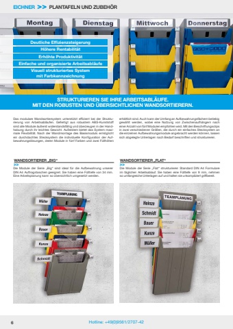 6 Hotline: +49(0)9561/2707-42EICHNER >> PLANTAFELN UND ZUBEH%u00d6RSTRUKTURIEREN SIE IHRE ARBEITSABL%u00c4UFE.MIT DEN ROBUSTEN UND %u00dcBERSICHTLICHEN WANDSORTIERERN.Das modulare Wandsortiersystem unterst%u00fctzt effizient bei der Strukturierung von Arbeitsabl%u00e4ufen. Gefertigt aus robustem ABS-Kunststoff sind alle Module %u00e4u%u00dferst widerstandsf%u00e4hig und %u00fcberzeugen in der Handhabung durch ihr leichtes Gewicht. Au%u00dferdem bietet das System maximale Flexibilit%u00e4t. Nach der Wandmontage des Basismoduls erm%u00f6glicht ein durchdachtes Stecksystem die individuelle Konfiguration der Aufbewahrungsl%u00f6sungen, deren Module in f%u00fcnf Farben und zwei F%u00fcllh%u00f6hen erh%u00e4ltlich sind. Auch kann der Umfang an Aufbewahrungsf%u00e4chern beliebig gew%u00e4hlt werden, wobei eine Nutzung von Zwischenaufh%u00e4ngern nach einer Anzahl von f%u00fcnf Modulen empfohlen wird. Mit den Beschriftungsclips in zwei verschiedenen Gr%u00f6%u00dfen, die durch ein einfaches Stecksystem an die einzelnen Aufbewahrungsmodule angebracht werden k%u00f6nnen, lassen sich abgelegte Unterlagen nach Bedarf beschriften und strukturieren.Deutliche EffizienzsteigerungH%u00f6here Rentabilit%u00e4tErh%u00f6hte Produktivit%u00e4tEinfache und organisierte Arbeitsabl%u00e4ufeVisuell strukturiertes Systemmit FarbkennzeichnungWANDSORTIERER %u201eBIG%u201c>>WANDSORTIERER %u201eFLAT%u201c>>Die Module der Serie %u201eBig%u201c sind ideal f%u00fcr die Aufbewahrung unserer DIN A4 Auftragstaschen geeignet. Sie haben eine F%u00fclltiefe von 34 mm.Eine Arbeitsplanung kann so %u00fcbersichtlich umgesetzt werden.Die Module der Serie %u201eFlat%u201c strukturieren Standard DIN A4 Formulare im t%u00e4glichen Arbeitsablauf. Sie haben eine F%u00fclltiefe von 9 mm, nehmenso umfangreiche Unterlagen auf und halten sie unkompliziert griffbereit.