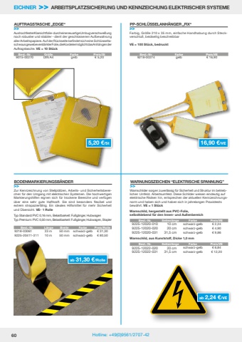 60 Hotline: +49(0)9561/2707-42Best.-Nr. Gr%u00f6%u00dfe Farbe Preis/St9015-00270 DIN A4 gelb %u20ac 5,20Best.-Nr. Farbe Preis/VE9218-00274 gelb %u20ac 16,9016,90 %u20ac/VEab 2,24 %u20ac/VEBest.-Nr. L%u00e4nge Breite Farbe Preis/Rolle9218-03061 33 m 50 mm schwarz-gelb %u20ac 31,309225-20411-311 10 m 50 mm schwarz-gelb %u20ac 80,50Aus hochfester Klarsichtfolie - durch eine neuartige Umbugverschwei%u00dfung noch robuster und stabiler - dient der geschlossenen Aufbewahrung aller Arbeitspapiere. Auf der R%u00fcckseite befindet sich eine Schl%u00fcsseltasche aus gewebeverst%u00e4rkter Folie, die Kordel erm%u00f6glicht das Anh%u00e4ngen der Auftragstasche. VE = 10 St%u00fcckAUFTRAGSTASCHE %u201eEDGE%u201c>>Best.-Nr. Seitenl%u00e4nge Farbe Preis/VE9225-12020-010 10 cm schwarz-gelb %u20ac 2,249225-12020-020 20 cm schwarz-gelb %u20ac 4,909225-12020-031 31,5 cm schwarz-gelb %u20ac 9,86Best.-Nr. Seitenl%u00e4nge Farbe Preis/VE9225-12022-020 20 cm schwarz-gelb %u20ac 6,849225-12022-031 31,5 cm schwarz-gelb %u20ac 12,20Farbig, Gr%u00f6%u00dfe 210 x 35 mm, einfache Handhabung durch Steckverschlu%u00df, beidseitig beschreibbarVE = 100 St%u00fcck, bedrucktPP-SCHL%u00dcSSELANH%u00c4NGER %u201eFIX%u201c>>WARNUNGSZEICHEN %u201cELEKTRISCHE SPANNUNG%u201d>>Warnschilder sorgen zuverl%u00e4ssig f%u00fcr Sicherheit und Struktur im betrieblichen Umfeld. Arbeitsumfeld. Diese Schilder weisen eindeutig auf elektrische Risiken hin, entsprechen der aktuellen Kennzeichnungsnorm und haben sich und haben sich in jahrelangen Praxistests bew%u00e4hrt. VE = 1 St%u00fcckWarnschild, hergestellt aus PVC-Folie, selbstklebend f%u00fcr den Innen- und Au%u00dfenbereichWarnschild, aus Kunststoff, Dicke 1,0 mmBODENMARKIERUNGSB%u00c4NDER>>Zur Kennzeichnung von Stellpl%u00e4tzen, Arbeits- und Sicherheitsbereichen f%u00fcr den Umgang mit elektrischen Systemen. Die hochwertigen Markierungshilfen eignen sich f%u00fcr trockene Bereiche und verf%u00fcgen %u00fcber eine sehr gute Haftkraft. Sie sind besonders flexibel undextrem strapazierf%u00e4hig. Ein ideales Hilfsmittel f%u00fcr mehr Sicherheit und %u00dcbersicht. VE- 1 RolleTyp Standard:PVC 0,16 mm, Belastbarkeit: Fu%u00dfg%u00e4nger, HubwagenTyp Premium:PVC 0,50 mm,Belastbarkeit: Fu%u00dfg%u00e4nger, Hubwagen, Stapler5,20 %u20ac/St ab 31,30 %u20ac/RolleEICHNER >> ARBEITSPLATZSICHERUNG UND KENNZEICHUNG ELEKTRISCHER SYSTEME