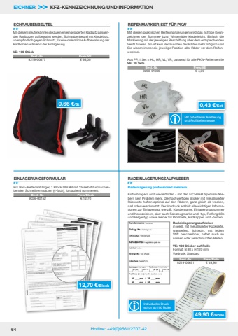 64 Hotline: +49(0)9561/2707-42Radeinlagerung professionell meistern.Einfach lagern und wiederfinden - mit den EICHNER Spezialaufklebern kein Problem mehr. Die hochwertigen Sticker mit metallisierter R%u00fcckseite haften optimal auf den R%u00e4dern, ganz gleich ob trocken, na%u00df oder verschmutzt. Der Vordruck enth%u00e4lt alle wichtigen Informationen zur Einlagerung, wie z.B. Kundenname, Einlagerungsnummer und Kennzeichen, aber auch Fahrzeugmarke und -typ, Reifengr%u00f6%u00dfe und Felgentyp sowie Felder f%u00fcr Profiltiefe, Radkappen und -bolzen.Radeinlagerungsaufkleberin wei%u00df, mit metallisierter R%u00fcckseite, wasserfest, lichtecht, mit jedem Stift beschreibbar, haftet auch an nassen oder verschmutzten Reifen.VE: 100 Sticker auf RolleFormat: B 80 x H 120 mmVordruck: StandardF%u00fcr Rad-/Reifenanh%u00e4nger, 1 Block DIN A4 mit 25 selbstdurchschreibenden Schnelltrenns%u00e4tzen (4-fach), fortlaufend nummeriert.Mit diesem Beutel k%u00f6nnen die zu einem eingelagerten Radsatz passenden Radbolzen aufbewahrt werden. Schraubenbeutel mit Kordelzug, unempfindlich gegen Schmutz, f%u00fcr eine ordentliche Aufbewahrung der Radbolzen w%u00e4hrend der Einlagerung.VE: 100 St%u00fcckMit diesen praktischen Reifenmarkierungen wird das richtige Kennzeichnen der Sommer- bzw. Winterr%u00e4der kinderleicht. Einfach die Markierung mit der jeweiligen Beschriftung %u00fcber dem entsprechendenVentil fixieren. So ist kein Vertauschen der R%u00e4der mehr m%u00f6glich und Sie wissen immer die jeweilige Position aller R%u00e4der vor dem Reifenwechsel.Aus PP, 1 Set = HL, HR, VL, VR, passend f%u00fcr alle PKW-ReifenventileVE: 10 SetsEICHNER >> KFZ-KENNZEICHNUNG UND INFORMATIONEINLAGERUNGSFORMULAR>>SCHRAUBENBEUTEL>>RADEINLAGERUNGSAUFKLEBER>>REIFENMARKIER-SET F%u00dcR PKW>>0,66 %u20ac/St 0,43 %u20ac/Set12,70 %u20ac/Block49,90 %u20ac/RolleBest.-Nr. Preis/Block 9036-00152 %u20ac 12,70Best.-Nr. Preis/VE 9219-00677 %u20ac 66,00Best.-Nr. Preis/VE 9208-01000 %u20ac 4,30Best.-Nr. Preis/Rolle 9219-00651 %u20ac 49,90Individueller Druckschon ab 100 RollenMit patentierter Arretierung und Profiltiefenmesser