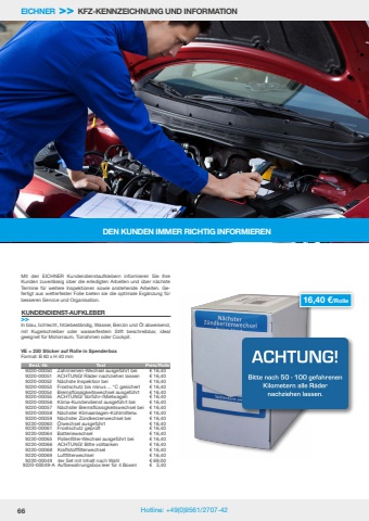 66 Hotline: +49(0)9561/2707-42EICHNER >> KFZ-KENNZEICHNUNG UND INFORMATIONDEN KUNDEN IMMER RICHTIG INFORMIERENMit den EICHNER Kundendienstaufklebern informieren Sie Ihre Kunden zuverl%u00e4ssig %u00fcber die erledigten Arbeiten und %u00fcber n%u00e4chste Termine f%u00fcr weitere Inspektionen sowie anstehende Arbeiten. Gefertigt aus wetterfester Folie bieten sie die optimale Erg%u00e4nzung f%u00fcr besseren Service und Organisation.VE = 250 Sticker auf Rolle in SpenderboxFormat: B 60 x H 40 mmKUNDENDIENST-AUFKLEBER>>In blau, lichtecht, hitzebest%u00e4ndig, Wasser, Benzin und %u00d6l abweisend, mit Kugelschreiber oder wasserfestem Stift beschreibbar, ideal geeignet f%u00fcr Motorraum, T%u00fcrrahmen oder Cockpit.Best.-Nr. Text Preis/Rolle 9220-00050 Zahnriemen-Wechsel ausgef%u00fchrt bei %u20ac 16,409220-00051 ACHTUNG! R%u00e4der nachziehen lassen %u20ac 16,409220-00052 N%u00e4chste Inspektion bei %u20ac 16,409220-00053 Frostschutz bis minus ... %u00b0C gesichert %u20ac 16,409220-00054 Bremsfl%u00fcssigkeitswechsel ausgef%u00fchrt %u20ac 16,409220-00055 ACHTUNG! Vorf%u00fchr-/Mietwagen %u20ac 16,409220-00056 Klima-Kundendienst ausgef%u00fchrt bei %u20ac 16,409220-00057 N%u00e4chster Bremsfl%u00fcssigkeitswechsel bei %u20ac 16,409220-00058 N%u00e4chster Klimaanlagen-K%u00fchlmittelw. %u20ac 16,409220-00059 N%u00e4chster Z%u00fcndkerzenwechsel bei %u20ac 16,409220-00060 %u00d6lwechsel ausgef%u00fchrt %u20ac 16,409220-00061 Frostschutz gepr%u00fcft %u20ac 16,409220-00064 Batteriewechsel %u20ac 16,409220-00065 Pollenfilter-Wechsel ausgef%u00fchrt bei %u20ac 16,409220-00066 ACHTUNG! Bitte volltanken %u20ac 16,409220-00068 Kraftstofffilterwechsel %u20ac 16,409220-00069 Luftfilterwechsel %u20ac 16,409220-00049 4er Set mit Inhalt nach Wahl %u20ac 69,009220-00049-A Aufbewahrungsbox leer f%u00fcr 4 Boxen %u20ac 3,4016,40 %u20ac/Rolle