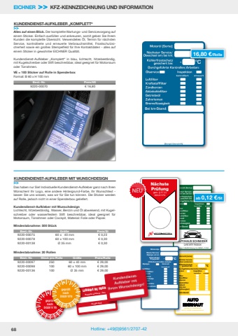68 Hotline: +49(0)9561/2707-4224 25 26 27 28 296 543 2 112 11 1098 6 7gepr%u00fcft nach DGUV V 70 kontrolliert erneuert Lu%ufffdfilter Kra%ufffdstofffilter Z%u00fcndkerzen Ak%ufffdvkohlefilter Getriebe%u00f6l Zahnriemen Bremsfl%u00fcssigkeit Bei km-Stand:Durchgef%u00fchrte Kontrollen/Arbeiten: %u00d6lservice Inspek%ufffdon Motor%u00f6l (Sorte):N%u00e4chster Service/ %u00d6lwechsel am/bei km:K%u00fchlerfrostschutz gesichert bis: - %u00b0CEichfeld 127 %u2022 8480 Mureck 034 72 / 30 480 %u2022 www.eberhaut.at Eichfeld 127 %uf06c 8480 Mureck034 72 / 30 480 %uf06c ww.eberhaut.at Eichfeld 127 %uf06c 8480 Mureck034 72 / 30 480 %uf06c ww.eberhaut.atEICHNER >> KFZ-KENNZEICHNUNG UND INFORMATIONAlles auf einen Blick. Der komplette Wartungs- und Servicevorgang auf einem Sticker. Einfach ausf%u00fcllen und ankreuzen, somit geben Sie Ihrem Kunden die komplette %u00dcbersicht. Verwendetes %u00d6l, Termin f%u00fcr n%u00e4chsten Service, kontrollierte und erneuerte Verbrauchsmittel, Frostschutzsicherheit sowie ein gro%u00dfes Stempelfeld f%u00fcr Ihre Kontaktdaten - alles auf einem Sticker in gewohnter EICHNER Qualit%u00e4t.Kundendienst-Aufkleber %u201eKomplett%u201c in blau, lichtecht, hitzebest%u00e4ndig, mit Kugelschreiber oder Stift beschreibbar, ideal geeignet f%u00fcr Motorraum oder T%u00fcrrahmen.VE = 100 Sticker auf Rolle in SpenderboxFormat: B 60 x H 100 mmDas haben nur Sie! Individuelle Kundendienst-Aufkleber ganz nach Ihren W%u00fcnschen! Ihr Logo, eine andere Hintergrund-Farbe, Ihr Wunschtext - lassen Sie uns wissen, was wir f%u00fcr Sie tun k%u00f6nnen. Die Sticker werden auf Rolle, jedoch nicht in einer Spenderbox geliefert.Kundendienst-Aufkleber mit WunschdesignLichtecht, hitzebest%u00e4ndig, Wasser, Benzin und %u00d6l abweisend, mit Kugelschreiber oder wasserfestem Stift beschreibbar, ideal geeignet f%u00fcr Motorraum, T%u00fcrrahmen oder Cockpit, Material: Folie oder Papier.Mindestabnahme: 500 St%u00fcckMindestabnahme: 20 RollenKUNDENDIENST-AUFKLEBER %u201eKOMPLETT%u201c>>KUNDENDIENST-AUFKLEBER MIT WUNSCHDESIGN>>Best.-Nr. Preis/VE 9220-00070 %u20ac 16,80Best.-Nr. Gr%u00f6%u00dfe Preis/St 9220-00075 60 x 40 mm %u20ac 0,239220-00078 60 x 100 mm %u20ac 0,309220-00138 %u00d8 35 mm %u20ac 0,30Best.-Nr. St%u00fcck pro Rolle Gr%u00f6%u00dfe Preis/Rolle9220-00097 250 60 x 40 mm %u20ac 29,009220-00098 100 60 x 100 mm %u20ac 29,009220-00136 100 %u00d8 35 mm %u20ac 29,0016,80 %u20ac/Rolleab 0,12 %u20ac/St kontrollerad byteUtf%u00f6rda kontroller/arbete:Motorolja:N%u00e4sta Service/ Oljebyte vid km:Kylarv%u00e4tskaFryspunkt: - %u00b0COljebyte KontrollLuftfilterBr%u00e4nslefilterT%u00e4ndstiftKup%u00e9filterV%u00e4xell%u00e5dsoljaDrivremBromsv%u00e4tskaUtf%u00f6rd vid km:Au plus tardProchain service %u00e0 .. kmsLIQUIDE DE FREINN%u00e4chstePr%u00fcfunggem. %u00a7 57 (1)DGUV V7024 25 26 27 28 296 543 2 112 11 1098 6 7gepr%u00fcft nach DGUV V70NEU