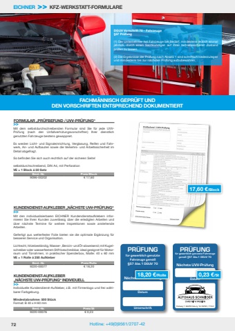 72 Hotline: +49(0)9561/2707-42Datum PR%u00dcFUNGf%u00fcr gewerblich genutzte Fahrzeugegem%u00e4%u00df %u00a757 Abs.1 DGUV 70N%u00e4chste UVV-Pr%u00fcfungPostweg 7, 96450 Coburg, Tel: 09561/774-0Datum UnterschriftPR%u00dcFUNGf%u00fcr gewerblich genutzteFahrzeuge gem%u00e4%u00df%u00a757 Abs.1 DGUV 70N%u00e4chste UVV-Pr%u00fcfungEICHNER >> KFZ-WERKSTATT-FORMULAREFACHM%u00c4NNISCH GEPR%u00dcFT UND DEN VORSCHRIFTEN ENTSPRECHEND DOKUMENTIERTMit dem selbstdurchschreibenden Formular sind Sie f%u00fcr jede UVVPr%u00fcfung (nach den Unfallverh%u00fctungsvorschriften) Ihrer dienstlich genutzten Fahrzeuge bestens gewappnet. Es werden Licht- und Signaleinrichtung, Verglasung, Reifen und Fahrwerk, An- und Aufbauten sowie die Verkehrs- und Arbeitssicherheit im Detail abgefragt. So befinden Sie sich auch rechtlich auf der sicheren Seite!selbstdurchschreibend, DIN A4, mit PerforationVE = 1 Block %u00e1 50 SatzFORMULAR %u201ePR%u00dcFBEFUND / UVV-PR%u00dcFUNG%u201c>>KUNDENDIENST-AUFKLEBER %u201eN%u00c4CHSTE UVV-PR%u00dcFUNG%u201c>>KUNDENDIENST-AUFKLEBER %u201eN%u00c4CHSTE UVV-PR%u00dcFUNG%u201c INDIVIDUELL>>17,60 %u20ac/Block18,20 %u20ac/Rolle 0,23 %u20ac/StBest.-Nr. Preis/Block 9096-00202 %u20ac 17,60Best.-Nr. Preis/Rolle 9220-00077 %u20ac 18,20Best.-Nr. Preis/St 9220-00076 %u20ac 0,23Mit den individualisierbaren EICHNER Kundendienstaufklebern informieren Sie Ihren Kunden zuverl%u00e4ssig %u00fcber die erledigten Arbeiten und %u00fcber n%u00e4chste Termine f%u00fcr weitere Inspektionen sowie anstehende Arbeiten. Gefertigt aus wetterfester Folie bieten sie die optimale Erg%u00e4nzung f%u00fcr besseren Service und Organisation.Lichtecht, hitzebest%u00e4ndig, Wasser-, Benzin- und %u00d6l-abweisend; mit Kugelschreiber oder wasserfestem Stift beschreibbar, ideal geeignet f%u00fcr Motorraum und T%u00fcrrahmen, in praktischer Spenderbox, Ma%u00dfe: 40 x 60 mmVE = 1 Rolle %u00e1 250 AufkleberIndividuelle Kundendienst-Aufkleber, z.B. mit Firmenlogo und frei w%u00e4hlbarer Farbgebung.Mindestabnahme: 500 St%u00fcckFormat: B 40 x H 60 mmDGUV Vorschrift 70 - Fahrzeuge%u00a757 Pr%u00fcfung(1) Der Unternehmer hat Fahrzeuge bei Bedarf, mindestens jedoch einmal j%u00e4hrlich, durch einen Sachkundigen auf ihren betriebssicheren Zustand pr%u00fcfen zu lassen.(2) Die Ergebnisse der Pr%u00fcfung nach Absatz 1 sind schriftlich niederzulegen und mindestens bis zur n%u00e4chsten Pr%u00fcfung aufzubewahren.
