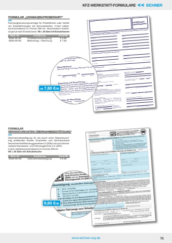 www.eichner-org.de 75Fahrzeugbenutzungsvertr%u00e4ge f%u00fcr Probefahrten oder Verleih von Ersatzfahrzeugen bei Servicearbeiten. 2-fach selbstdurchschreibend im Format DIN A4. Verschiedene Ausf%u00fchrungen je nach Einsatzzweck. VE = 25 Satz mit SchutztascheFORMULAR %u201eLEIHWAGEN/PROBEFAHRT%u201c>>Best.-Nr. Ausf%u00fchrung Preis/VE9036-00164 Probefahrtvereinbarung %u20ac 9,909036-00163 Mietvertrag + Rechnung %u20ac 7,60%u00dcbernahmebest%u00e4tigung f%u00fcr die durch einen Reparaturauftrag anfallenden Kosten. Empfohlen vom Zentralverband Deutsches Kraftfahrzeuggewerbe e.V. (ZDK) und vom Zentralverband Karosserie- und Fahrzeugtechnik e.V. (ZKF).2-fach selbstdurchschreibend im Format DIN A4.VE = 25 Satz mit SchutztascheFORMULAR REPARATURKOSTEN-%u00dcBERNAHMEBEST%u00c4TIGUNG%u201c>>Best.-Nr. Ausf%u00fchrung Preis/VE9036-00158 %u00dcbernahmebest%u00e4tigung %u20ac 9,909,90 %u20ac/StFirma/VerleiherPROBEFAHRTVEREINBARUNGZu den nachfolgenden Bedingungen, wird zwischen der oben genannten Firma/Verleiher und dem folgendgenannten Benutzer folgende Vereinbarung getroffen.%u0009%u0009 %u0009Telefon-Nr.%u0009%u0009 %u0009PLZ/Ort%u0009%u0009 %u0009geb. am%u0009%u0009 %u0009F%u00fchrerscheinklasse%u0009%u0009 %u0009Ausstellungsdatum%u0009%u0009 %u0009Name/Vorname%u0009%u0009 %u0009Stra%u00dfe/Nr.%u0009%u0009 %u0009Pa%u00df-Nr.%u0009%u0009 %u0009F%u00fchrerschein-Nr.%u0009%u0009 %u0009Ausstellende Beh%u00f6rdeDer Verleiher %u00fcberl%u00e4%u00dft dem Benutzer das Fahrzeug%u0009%u0009 %u0009amtl. Kennzeichen%u0009%u0009 %u0009km-Stand%u0009%u0009 %u0009Fahrzeug-Typ%u0009%u0009 %u0009Fahrgestell-Nr.%uf06c voll getankt %uf06c 3/4-voll getankt %uf06c 1/2-voll getankt %uf06c 1/4-voll getankt%u00fcbernommen wurden%uf06c Kraftfahrzeugpapiere %uf06c Betriebsanleitung %uf06c Kfz-Schl%u00fcssel %uf06c %u0009%u0009%u0009BordwerkzeugVerwendungszweck:Die Verwendung des Fahrzeugs ist nur dem Benutzer pers%u00f6nlichim Rahmen der vereinbarten Probefahrt erlaubt. Eine Benutzung zur gewerbsm%u00e4%u00dfigen Personenbef%u00f6rderung gegen Entgeld ist untersagt.Nutzungsdauer:Das Fahrzeug wird dem Benutzer f%u00fcr die Zeitvom bis %u00fcberlassen. Datum Uhrzeit Datum UhrzeitZulassung und Versicherung:Das Fahrzeug ist ordnungsgem%u00e4%u00df zugelassen und gegen die gesetzliche Haftpflicht auf unbegrenzte Deckungssumme f%u00fcr Personen-, Sach- und Verm%u00f6genssch%u00e4den sowie gegen Teilkaskorisiken (z.B. Brand und Diebstahl) versichert.Eine Freistellung im Umfang und nach den Bestimmungen einer Fahrzeugvollversicherung (Vollkasko) besteht nicht.Kosten der Benutzung:Der Benutzer verpflichtet sich, alle w%u00e4hrend der Benutzungsdauer erforderlichen Instandsetzungsarbeiten oder f%u00e4lligen Kundendienste durch den n%u00e4chstgelegenen Vertragsh%u00e4ndler auf seine Kostendurchf%u00fchren zu lassen.Die Probefahrt ist bis zu einer km-Leistungvon unentgeltlich. F%u00fcr jeden weiteren gefahrenen km hat der Benutzer eine Verg%u00fctung von %u20ac zzgl. MwSt. zu ent,richten.%u00dcbernahme: km-Stand Festgestellte M%u00e4ngel bei %u00dcbernahme: Ich best%u00e4tige, das Fahrzeug am um Uhr%u00fcbernommen zu haben. Ort, Datum Benutzer Stempel, Unterschrift VerleiherR%u00fcckgabe: km-Stand Datum UhrzeitFestgestellte M%u00e4ngel bei R%u00fcckgabe: Ort, Datum Benutzer Stempel, Unterschrift Verleiher%u0009%u0009Ausstellende Beh%u00f6rdeDer Verleiher %u00fcberl%u00e4%u00dft dem Benutzer das Fahrzeug%u0009%u0009 %u0009amtl. Kennzeichen%u0009%u0009 %u0009km-Stand%u0009%u0009 %u0009Fahrzeug-Typ%u0009%u0009 %u0009Fahrgestell-Nr.%uf06c voll getankt%uf06c 3/4-voll getankt %uf06c 1/2-voll getankt %uf06c 1/4-voll getankt%u00fcbernommen wurden%uf06c Kraftfahrzeugpapiere%uf06c Betriebsanleitung %uf06c Kfz-Schl%u00fcssel %uf06c %u0009%u0009%u0009BordwerkzeugVerwendungszweck:Die Verwendung des Fahrzeugs ist nur dem Benutzer pers%u00f6nlichim Rahmen der vereinbarten Probefahrt erlaubt. Eine Benutzung zur gewerbsm%u00e4%u00dfigen Personenbef%u00f6rderung gegen Entgeld ist untersagt.Nutzungsdauer:Das Fahrzeug wird dem Benutzer f%u00fcr die Zeitvom bis %u00fcberlassen. Datum Uhrzeit Datum UhrzeitZulassung und Versicherung:Das Fahrzeug ist ordnungsgem%u00e4%u00df zugelassen und gegen die gesetzliche Haftpflicht auf unbegrenzte Deckungssumme f%u00fcr Personen-, Sach- und Verm%u00f6genssch%u00e4den sowie gegen Teilkaskorisiken (z.B. Brand und Diebstahl) versichert.Eine Freistellung im Umfang und nach den Bestimmungen einer Fahrzeugvollversicherung (Vollkasko) besteht nicht.Kosten der Benutzung:Der Benutzer verpflichtet sich, alle w%u00e4hrend der Benutzungsdauer erforderlichen Instandsetzungsarbeiten oder f%u00e4lligen Kundendienste durch den n%u00e4chstgelegenen Vertragsh%u00e4ndler auf seine Kostendurchf%u00fchren zu lassen.Die Probefahrt ist bis zu einer km-Leistungvon unentgeltlich. F%u00fcr jeden weiteren gefahrenen km hat der Benutzer eine Verg%u00fctung von %u20ac zzgl. MwSt. zu ent,richten.%u00dcbernahme: km-Stand Festgestellte M%u00e4ngel bei %u00dcbernahme: Ich best%u00e4tige, das Fahrzeug am um Uhr%u00fcbernommen zu haben. Ort, Datum Benutzer Stempel, Unterschrift VerleiherR%u00fcckgabe: km-Stand Datum UhrzeitFestgestellte M%u00e4ngel bei R%u00fcckgabe: Ort, Datum Benutzer Stempel, Unterschrift Verleiherab 7,60 %u20ac/StKFZ-WERKSTATT-FORMULARE << EICHNER