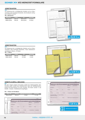 78 Hotline: +49(0)9561/2707-42EICHNER >> KFZ-WERKSTATT-FORMULAREARBEITSKARTEN>>ARBEITSKARTEN>>Zur Erfassung der zu erledigenden Arbeiten und zur Dokumentation %u00fcber ben%u00f6tigte Ersatzteile. Als Einzelkarte verf%u00fcgbar in DIN A4 und A5.VE = 500 KartenZur Erfassung der zu erledigenden Arbeiten und zur Dokumentation %u00fcber ben%u00f6tigte Ersatzteile. 2-fach selbstdurchschreibend (1 Block = 25 Satz).VE = 1 BlockBest.-Nr. Gr%u00f6%u00dfe VE Preis/VE9096-00197 DIN A4 500 Karten %u20ac 43,709096-00198 DIN A5 500 Karten %u20ac 26,50Best.-Nr. Gr%u00f6%u00dfe VE Preis/VE9096-00199 DIN A4 25 Satz %u20ac 9,009096-00200 DIN A5 25 Satz %u20ac 5,00ab 26,50 %u20ac/VEab 5,00 %u20ac/VEMit dem Original dieses Formulares meldet der Abteilungsleiter dem Lohnb%u00fcro jeden Ausfall eines Arbeitnehmers. Nach der Arbeitsaufnahme erfolgt die R%u00fcckmeldung mit dem Duplikat. Die Daten werden in die Arbeits-, Urlaubs-, Krankenkarte eingetragen. VE = 1 Block mit 50 S%u00e4tzenARBEITS-AUSFALL-MELDUNG>>Best.-Nr. Format selbstdurchschreibend Preis/VE9606-00551 DIN A5 2-fach %u20ac 7,507,50 %u20ac/VEselbstdurchschreibend