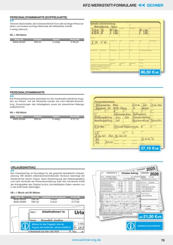www.eichner-org.de 79KFZ-WERKSTATT-FORMULARE << EICHNERab 21,50 %u20ac/VEDer Urlaubsantrag ist Grundlage f%u00fcr die gesamte betriebliche Urlaubsplanung. Mit diesem selbstdurchschreibenden Vordruck beantragt der Arbeitnehmer seinen Urlaub. Nach Genehmigung des Abteilungsleiters und nach Kontrolle der Personalverwaltung oder des Lohnb%u00fcros erh%u00e4lt der Antragsteller das Original zur%u00fcck; die best%u00e4tigten Daten werden nun in die AUK-Karte %u00fcbertragen.VE = 1 Block mit 50 S%u00e4tzenURLAUBSANTRAG>>Best.-Nr. Format selbstdurchschreibend Preis/VE9606-00550 DIN A5 2-fach %u20ac 21,509606-00586 DIN A5 3-fach %u20ac 27,60Bl%u00f6cke f%u00fcr das Folgejahr sind abAugust des laufenden Jahres erh%u00e4ltlich! selbstdurchschreibendBest.-Nr. Format Seiten Preis/VE9606-00562 DIN A4 4-seitig %u20ac 86,50Teil einer Stammdatei, die in %u00fcbersichtlicher Form alle wichtigen Personaldaten und andere wichtige Merkmale der Mitarbeiter enth%u00e4lt.4-seitig bedruckt.VE = 100 St%u00fcckPERSONALSTAMMKARTE (DOPPELKARTE)>>Best.-Nr. Format Seiten Preis/VE9606-00563 DIN A5 2-seitig %u20ac 37,10Die Personalstammkarte beinhaltet auf der Vorderseite s%u00e4mtliche Angaben zur Person. Auf der R%u00fcckseite werden die Lohn-Gehalts-Entwicklung, Zuwendungen des Arbeitgebers sowie die steuerlichen Belange aufgezeichnet.VE = 100 St%u00fcckPERSONALSTAMMKARTE>>86,50 %u20ac/VE37,10 %u20ac/VE