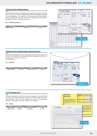 www.eichner-org.de 81KFZ-WERKSTATT-FORMULARE << EICHNERBest.-Nr. Format Preis/VE9606-00188 DIN A5 %u20ac 11,70Best.-Nr. Format Endma%u00df Preis/VE9606-00587 DIN C5 228 x 162 mm %u20ac 16,50Die Reisekosten sind vom Gesetzgeber festgelegt. Der Kostennachweis dient zum einen als Abrechnungsgrundlage %u00fcber alle get%u00e4tigten Ausgaben f%u00fcr den Arbeitgeber, zum anderen zur Nachpr%u00fcfung durch den Gesetzgeber. Die R%u00fcckseite zeigt den Nachweis der gefahrenen Kilometer einschlie%u00dflich aller Kfz- und Nebenkosten auf.VE = 100 Blatt pro BlockREISEKOSTEN-ABRECHNUNG>>Der praktische Belegsammler f%u00fcr unterwegs und f%u00fcr das Personalb%u00fcro. Die Vorder- und R%u00fcckseiten-Organisationsinhalte entsprechen dem Einzelblattformular. Format 228 x 162 mm.Format DIN C5.VE = 50 St%u00fcckREISEKOSTEN-ABRECHNUNG-BELEGTASCHE>>11,70 %u20ac/VE16,50 %u20ac/VEDie Quittungsbl%u00f6cke f%u00fcr die Einnahme oder Ausgabe im Format DIN A6 sorgen f%u00fcr den n%u00f6tigen %u00dcberblick und geben einen Nachweis %u00fcber geleistete Zahlungen. Sie sind 2-fach gelocht und mit einer Pappunterlage versehen. Jeder Block hat einen Umfang von 100 Blatt.VE = 1 BlockQUITTUNGSBLOCK>>Best.-Nr. Format Ausf%u00fchrung Preis/VE9606-00185 DIN A6 Quittung/Einnahme %u20ac 7,009606-00186 DIN A6 Ausgabe %u20ac 7,00Best.-Nr. 9606-00185 EICHNER Organisation GmbH & Co. KG, Postfach 1538, 96405 CoburgQuittung/EinnahmeEndbetrag%u2013 % SkontoGesamtbetrag+ VorsteuerNettowertBeleg Nr.EUREUREUREUREUREUR in Worten (brutto)Konto Lastschrift BuchungsvermerkEmpfangsbest%u00e4tigung, denUnterschriftZahlung vonf%u00fcr9606-00185.indd 1 04.10.2018 11:26:397,- %u20ac/VE