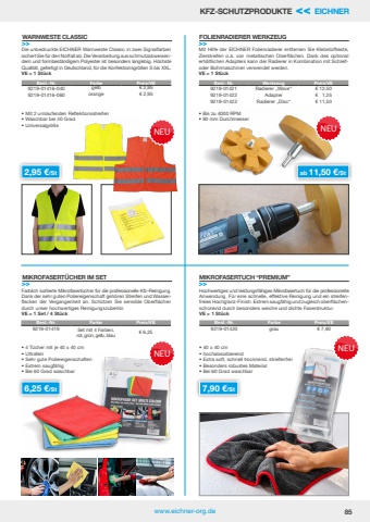 www.eichner-org.de 85KFZ-SCHUTZPRODUKTE << EICHNERBest.-Nr. Farbe Preis/VE9219-01416-040 gelb %u20ac 2,959219-01416-060 orange %u20ac 2,95Best.-Nr. Werkzeug Preis/VE9219-01421 Radierer %u201eWave%u201c %u20ac 12,509219-01422 Adapter %u20ac 1,259219-01423 Radierer %u201eDisc%u201c %u20ac 11,50WARNWESTE CLASSIC>>FOLIENRADIERER WERKZEUG>>Die unbedruckte EICHNER Warnweste Classic in zwei Signalfarben sichert Sie f%u00fcr den Notfall ab. Die Verarbeitung aus schmutzabweisendem und formbest%u00e4ndigem Polyester ist besonders langlebig. H%u00f6chste Qualit%u00e4t, gefertigt in Deutschland, f%u00fcr die Konfektionsgr%u00f6%u00dfen S bis XXL.VE = 1 St%u00fcckMit Hilfe der EICHNER Folienradierer entfernen Sie Klebstoffreste, Zierstreifen o.%u00e4. von metallischen Oberfl%u00e4chen. Dank des optional erh%u00e4ltlichen Adapters kann der Radierer in Kombination mit Schleifoder Bohrmaschinen verwendet werden.VE = 1 St%u00fcckMIKROFASERT%u00dcCHER IM SET>>Farblich sortierte Mikrofasert%u00fccher f%u00fcr die professionelle Kfz-Reinigung. Dank der sehr guten Poliereigenschaft geh%u00f6ren Streifen und Wasserflecken der Vergangenheit an. Sch%u00fctzen Sie sensible Oberfl%u00e4chen durch unser hochwertiges Reinigungszubeh%u00f6r.VE = 1 Set / 4 St%u00fcck%u2022 4 T%u00fccher mit je 40 x 40 cm%u2022 Ultrafein%u2022 Sehr gute Poliereigenschaften%u2022 Extrem saugf%u00e4hig%u2022 Bei 60 Grad waschbar%u2022 Mit 2 umlaufenden Reflektionsstreifen%u2022 Waschbar bei 40 Grad%u2022 Universalgr%u00f6%u00dfe%u2022 Bis zu 4000 RPM%u2022 90 mm Durchmesser%u2022 40 x 40 cm%u2022 hochabsorbierend%u2022 Extra soft, schnell trocknend, streifenfrei%u2022 Besonders robustes Material%u2022 Bei 60 Grad waschbarBest.-Nr. Farbe Preis/VE9219-01419 Set mit 4 Farben,rot, gr%u00fcn, gelb, blau %u20ac 6,25MIKROFASERTUCH %u201cPREMIUM%u201d>>Hochwertiges und leistungsf%u00e4higes Mikrofasertuch f%u00fcr die professionelle Anwendung. F%u00fcr eine schnelle, effektive Reinigung und ein streifenfreies Hochglanz-Finish. Extrem saugf%u00e4hig und zugleich oberfl%u00e4chenschonend durch besonders weiche und dichte Faserstruktur.VE = 1 St%u00fcckBest.-Nr. Farbe Preis/VE9219-01420 grau %u20ac 7,90NEUNEU NEUNEU2,95 %u20ac/St ab 11,50 %u20ac/St6,25 %u20ac/St 7,90 %u20ac/St