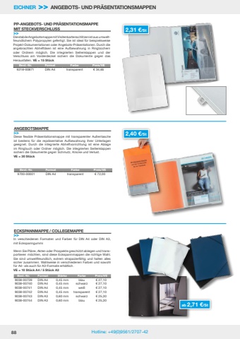 88 Hotline: +49(0)9561/2707-42EICHNER >> ANGEBOTS- UND PR%u00c4SENTATIONSMAPPENPP-ANGEBOTS- UND PR%u00c4SENTATIONSMAPPE MIT STECKVERSCHLUSS>>ANGEBOTSMAPPE>>ECKSPANNMAPPE / COLLEGEMAPPE>>Die stabile Angebotsmappe mit Visitenkartenschlitzen ist aus umweltfreundlichem Polypropylen gefertigt. Sie ist ideal f%u00fcr beispielsweise Projekt-Dokumentationen oder Angebots-Pr%u00e4sentationen. Durch die angebrachten Abheft%u00f6sen ist eine Aufbewahrung in Ringb%u00fcchern oder Ordnern m%u00f6glich. Die integrierten Seitenklappen und der Verschluss am Vorderdeckel sichern die Dokumente gegen das Herausfallen. VE = 15 St%u00fcckDiese flexible Pr%u00e4sentationsmappe mit transparenter Au%u00dfentasche ist bestens f%u00fcr die repr%u00e4sentative Aufbewahrung Ihrer Unterlagen geeignet. Durch die integrierte Abheftvorrichtung ist eine Ablage im Ringbuch oder Ordner m%u00f6glich. Die integrierten Seitenklappen sichern die Dokumente gegen Schmutz, Knicke und Verlust.VE = 30 St%u00fcckIn verschiedenen Formaten und Farben f%u00fcr DIN A4 oder DIN A3, mit EckspanngummiWenn Sie Pl%u00e4ne, Akten oder Prospekte gesch%u00fctzt ablegen und transportieren m%u00f6chten, sind diese Eckspannmappen die richtige Wahl. Sie sind umweltfreundlich, extrem strapazierf%u00e4hig und halten alles sicher zusammen. Wahlweise in verschiedenen Farben und sowohl f%u00fcr A4- als auch f%u00fcr A3-Formate erh%u00e4ltlich.VE = 10 St%u00fcck A4 / 5 St%u00fcck A3 Best.-Nr. Format St%u00e4rke Farbe Preis/VE 9038-00739 DIN A4 0,45 mm blau %u20ac 27,109038-00740 DIN A4 0,45 mm schwarz %u20ac 27,109038-00741 DIN A4 0,45 mm wei%u00df %u20ac 27,109038-00742 DIN A4 0,45 mm transparent %u20ac 27,109038-00743 DIN A3 0,60 mm schwarz %u20ac 25,309038-00744 DIN A3 0,60 mm blau %u20ac 25,30Best.-Nr. Format Farbe Preis/VE9218-00871 DIN A4 transparent %u20ac 34,65Best.-Nr. Format Farbe Preis/VE9700-00001 DIN A4 transparent %u20ac 72,002,31 %u20ac/St2,40 %u20ac/Stab 2,71 %u20ac/St