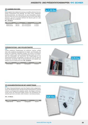 www.eichner-org.de 89ANGEBOTS- UND PR%u00c4SENTATIONSMAPPEN << EICHNERab 1,15 %u20ac/StPP-SAMMELTASCHEN>>PR%u00c4SENTATIONS- UND PROJEKTMAPPE>>PP-DOKUMENTENTASCHE MIT ABHEFTRAND>>Diese stabilen Sammeltaschen sind aus umweltfreundlicher 0,45 mm starker Polypropylen-Folie gefertigt. Sie haben einen integrierten Einsteckverschluss, der Dokumente vor der Herausfallen sch%u00fctzt. Dennoch l%u00e4sst sich durch die transparente Folie auf den ersten Blick erkennen, was sich im Inneren befindet. Die Taschen gibt es in den Formaten DIN A4 und DIN A5. VE = 20 St%u00fcckUnsere praktische Projektmappe mit seitlichen Laschen verf%u00fcgt %u00fcber zwei zus%u00e4tzliche Innentaschen f%u00fcr Vorder- und R%u00fcckseite. So lassen sich beidseitig Titelbl%u00e4tter einlegen. Die unteren und %u00e4u%u00dferen Laschen werden durch einen Spezialverschluss fixiert und verhindern ein Herausfallen der Dokumente. Die Projektmappe ist mit Visitenkartenschlitzen ausgestattet und l%u00e4sst sich auch f%u00fcr DIN A3 Dokumente verwenden. Sie ist dokumentenecht und besteht aus stabiler 0,30 mm starker PP-Folie. VE = 30 St%u00fcckIn dieser Dokumententasche sind Ihre Papiere sicher aufgehoben. Durch den Abheftrand kann die DIN A4 Dokumententasche in diverse Ordnern und Ringb%u00fcchern abgelegt werden. Die Klappe mit Druckknopf sichert die Dokumente gegen Verlust. Die transparente Vorderseite gibt einen schnellen ersten Einblick in die Dokumentation.VE = 10 St%u00fcckBest.-Nr. Format Farbe Preis/VE9700-00032 DIN A4 transparent %u20ac 82,50Best.-Nr. Format Farbe Preis/VE9038-00748 DIN A4 transparent %u20ac 8,10Best.-Nr. Format Farbe Preis/VE9038-00737 DIN A4 semi-transparent %u20ac 39,80 9038-00738 DIN A5 semi-transparent %u20ac 23,002,75 %u20ac/St0,81 %u20ac/St