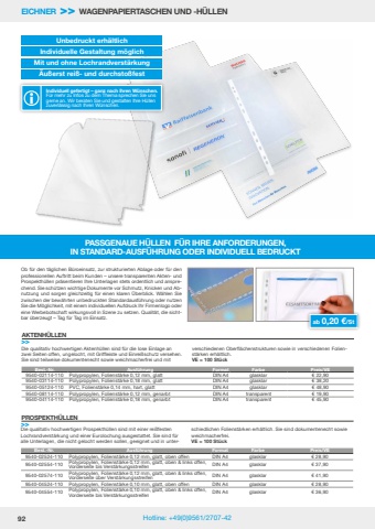 92 Hotline: +49(0)9561/2707-42EICHNER >> WAGENPAPIERTASCHEN UND -H%u00dcLLENBest.-Nr. Ausf%u00fchrung Format Farbe Preis/VE9540-02524-110 Polypropylen, Folienst%u00e4rke 0,12 mm, glatt, oben offen DIN A4 glasklar %u20ac 28,909540-02554-110 Polypropylen, Folienst%u00e4rke 0,12 mm, glatt, oben & links offen,Vorderseite bis Verst%u00e4rkungsstreifen DIN A4 glasklar %u20ac 37,909540-02574-110 Polypropylen, Folienst%u00e4rke 0,12 mm, glatt, oben & links offen,Vorderseite %u00fcber Verst%u00e4rkungsstreifen DIN A4 glasklar %u20ac 41,909540-04524-110 Polypropylen, Folienst%u00e4rke 0,10 mm, glatt, oben offen DIN A4 glasklar %u20ac 28,909540-04554-110 Polypropylen, Folienst%u00e4rke 0,10 mm, glatt, oben & links offen,Vorderseite bis Verst%u00e4rkungsstreifen DIN A4 glasklar %u20ac 36,90Best.-Nr. Ausf%u00fchrung Format Farbe Preis/VE9540-02114-110 Polypropylen, Folienst%u00e4rke 0,12 mm, glatt DIN A4 glasklar %u20ac 22,909540-03114-110 Polypropylen, Folienst%u00e4rke 0,18 mm, glatt DIN A4 glasklar %u20ac 38,209540-05124-110 PVC, Folienst%u00e4rke 0,14 mm, hart, glatt DIN A4 glasklar %u20ac 48,909540-08114-110 Polypropylen, Folienst%u00e4rke 0,12 mm, genarbt DIN A4 transparent %u20ac 19,909540-04114-110 Polypropylen, Folienst%u00e4rke 0,18 mm, genarbt DIN A4 transparent %u20ac 45,90AKTENH%u00dcLLEN>>PROSPEKTH%u00dcLLEN>>Ob f%u00fcr den t%u00e4glichen B%u00fcroeinsatz, zur strukturierten Ablage oder f%u00fcr den professionellen Auftritt beim Kunden %u2013 unsere transparenten Akten- und Prospekth%u00fcllen pr%u00e4sentieren Ihre Unterlagen stets ordentlich und ansprechend. Sie sch%u00fctzen wichtige Dokumente vor Schmutz, Knicken und Abnutzung und sorgen gleichzeitig f%u00fcr einen klaren %u00dcberblick. W%u00e4hlen Sie zwischen der bew%u00e4hrten unbedruckten Standardausf%u00fchrung oder nutzen Sie die M%u00f6glichkeit, mit einem individuellen Aufdruck Ihr Firmenlogo oder eine Werbebotschaft wirkungsvoll in Szene zu setzen. Qualit%u00e4t, die sichtbar %u00fcberzeugt %u2013 Tag f%u00fcr Tag im Einsatz.Die qualitativ hochwertigen Aktenh%u00fcllen sind f%u00fcr die lose Einlage an zwei Seiten offen, ungelocht, mit Griffleiste und Einrei%u00dfschutz versehen.Sie sind teilweise dokumentenecht sowie weichmacherfrei und mit verschiedenen Oberfl%u00e4chenstrukturen sowie in verschiedenen Folienst%u00e4rken erh%u00e4ltlich. VE = 100 St%u00fcckDie qualitativ hochwertigen Prospekth%u00fcllen sind mit einer rei%u00dffesten Lochrandverst%u00e4rkung und einer Eurolochung ausgestattet. Sie sind f%u00fcr alle Unterlagen, die nicht gelocht werden sollen, geeignet und in unterschiedlichen Folienst%u00e4rken erh%u00e4ltlich. Sie sind dokumentenecht sowie weichmacherfrei.VE = 100 St%u00fcckab 0,20 %u20ac/StPASSGENAUE H%u00dcLLEN F%u00dcR IHRE ANFORDERUNGEN,IN STANDARD-AUSF%u00dcHRUNG ODER INDIVIDUELL BEDRUCKTIndividuell gefertigt %u2013 ganz nach Ihren W%u00fcnschen.F%u00fcr mehr zu Infos zu dem Thema sprechen Sie uns gerne an. Wir beraten Sie und gestalten Ihre H%u00fcllen zuverl%u00e4ssig nach Ihren W%u00fcnschen.Unbedruckt erh%u00e4ltlichIndividuelle Gestaltung m%u00f6glichMit und ohne Lochrandverst%u00e4rkung%u00c4u%u00dferst rei%u00df- und durchsto%u00dffest