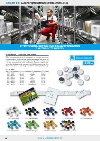 94 Hotline: +49(0)9561/2707-42EICHNER >> LAGERORGANISATION UND KENNZEICHNUNGDieser extra starke Magnet ist der ideale Helfer, um wichtigen Dokumente schnell und leicht sichtbar an den Magnet-Wandleisten oder auch am selbstklebenden Ferroband anzubringen. Geeignet f%u00fcr das B%u00fcro oder auch den Privatgebrauch, leicht anzubringen und auch wieder zu entfernen. Das Geh%u00e4use ist aus bruchsicherem ABS-Material gefertigt. Eine VE beinhaltet 20 St%u00fcck. Jeder Magnet besitzt eine hohe Haftkraft (0,6 kg).VE = 20 St%u00fcck9177-00511 wei%u00df9177-00516 hellblau9177-00512 schwarz9177-00517 hellgr%u00fcn9177-00513 blau9177-00518 hellgelb9177-00514 rot9177-00519 farbig sortiert9177-00515 orangeRUNDMAGNET, DURCHMESSER 30 MM>>Best.-Nr. Durchmesser Farbe Preis/VE9177-00511 30 mm wei%u00df %u20ac 14,909177-00512 30 mm schwarz %u20ac 14,909177-00513 30 mm blau %u20ac 14,909177-00514 30 mm rot %u20ac 14,909177-00515 30 mm orange %u20ac 14,909177-00516 30 mm hellblau %u20ac 14,909177-00517 30 mm hellgr%u00fcn %u20ac 14,909177-00518 30 mm hellgelb %u20ac 14,909177-00519 30 mm farbig sortiert %u20ac 14,9014,90%u20ac/VESTRUKTURIERTE, %u00dcBERSICHTLICHE LAGERORGANISATION F%u00dcR EFFIZIENTES ARBEITENSieben neue Farben, sowie einmal farbsortiert erh%u00e4ltlich.