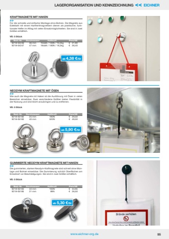 www.eichner-org.de 95LAGERORGANISATION UND KENNZEICHNUNG << EICHNERF%u00fcr die schnelle und einfache Montage ohne Bohren. Die Magnete aus Edelstahl mit einem Hartferritmagnetkern dienen als praktischer, funktionaler Helfer im Alltag mit vielen Einsatzm%u00f6glichkeiten. Sie sind in zwei Gr%u00f6%u00dfen erh%u00e4ltlich.VE: 5 St%u00fcckKRAFTMAGNETE MIT HAKEN>>Best.-Nr. Durchmesser Haftkraft Preis/VE9218-04246 36 mm 10daN / 100N / 10,2kg %u20ac 21,909218-04247 47 mm 18daN / 180N / 18,3kg %u20ac 26,40Wie auch die Magnete mit Haken ist die Ausf%u00fchrung mit %u00d6sen in vielen Bereichen einsetzbar. Zwei verschiedene Gr%u00f6%u00dfen bieten Flexibilit%u00e4t in der Nutzung und sind leicht anzubringen und zu entfernen.VE: 5 St%u00fcckNEODYM KRAFTMAGNETE MIT %u00d6SEN>>Best.-Nr. Durchmesser Haftkraft Preis/VE9218-05182 25 mm 190N %u20ac 29,509218-05183 40 mm 520N %u20ac 49,50Die gummierten, starken Neodym-Kraftmagnete sind schnell ohne Montage und Bohren einsetzbar. Die Gummierung sch%u00fctzt Oberfl%u00e4chen am Einsatzort vor Besch%u00e4digungen. Sie sind in zwei Gr%u00f6%u00dfen erh%u00e4ltlich.VE: 5 St%u00fcckGUMMIERTE NEODYM KRAFTMAGNETE MIT HAKEN>>Best.-Nr. Durchmesser Haftkraft Preis/VE9218-05184 43 mm 100N %u20ac 33,959218-05185 31 mm 89N %u20ac 26,50ab 4,38 %u20ac/Stab 5,90 %u20ac/Stab 5,30 %u20ac/St