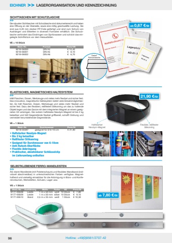 96 Hotline: +49(0)9561/2707-42EICHNER >> LAGERORGANISATION UND KENNZEICHNUNGDetail SchutzlascheH%u00e4lt Flaschen, Dosen, Werkzeuge und vieles mehr flexibel und sicher fest.Das innovative, magnetische Haltesystem bietet viele Einsatzm%u00f6glichkeiten. Es h%u00e4lt Flaschen, Dosen, Werkzeuge und vieles mehr flexibel und sicher fest. Dazu den flexiblen, rei%u00dffesten Silikonring um das zu haltende Objekt legen und das Ganze mit dem integrierten Magnet an einem geeigneten Ort anbringen. Der extrem haftstarke Neodym-Magnet ist bis 2 kg belastbar und h%u00e4lt Gegenst%u00e4nde flexibel griffbereit, schafft Ordnung und vermeidet herumstehende Gegenst%u00e4nde.VE = 1 St%u00fcckELASTISCHES, MAGNETISCHES HALTESYSTEM>>Best.-Nr. Durchmesser Preis/St9218-04597 geeignet f%u00fcr %u00d8 6-10 cm %u20ac 21,90%u2022 Haftstarker Neodym-Magnet%u2022 Bis 2 kg belastbar%u2022 Rei%u00dffester Silikonring%u2022 Geeignet f%u00fcr Durchmesser von 6-10cm %u2022 Anti-Rutsch-Oberfl%u00e4che%u2022 Flexible Anbringung%u2022 Praktischer, abnehmbarer Schl%u00fcsselclip im Lieferumfang enthaltenHaftstarkerNeodym-MagnetFlexibler, rei%u00dffester Silikonring21,90 %u20ac/StBest.-Nr. Format Preis/VE9218-06000 DIN A4 %u20ac 10,409218-06001 DIN A5 %u20ac 8,109218-06002 DIN A6 %u20ac 6,70Die robusten Sichttaschen mit Schutzlasche sind dokumentenecht und haben eine %u00d6ffnung an der Oberseite, sowie eine mittig geschwei%u00dfte Lochung. Sie sind aus 0,20 mm starker PP-Folie gefertigt und sind zum Schutz von Aush%u00e4ngen und Etiketten in diversen Formaten erh%u00e4ltlich. Die Schutzlasche verhindert das Eindringen von Spritzwasser und sch%u00fctzt das eingelegte Schriftst%u00fcck vor dem Herausfallen.VE = 10 St%u00fcckSICHTTASCHEN MIT SCHUTZLASCHE>>ab 0,67 %u20ac/St Als starre Wandleiste (mit Polsterschaum) und flexibles Wandband (individuell abschneidbar) in unterschiedlichen Farben verf%u00fcgbar. Magnethaftend und vielseitig einsetzbar f%u00fcr die Anbringung in B%u00fcro- und Konferenzr%u00e4umen, Werkst%u00e4tten, Schulen, Lager usw.VE = 1 St%u00fcckSELBSTKLEBENDE FERRO-WANDLEISTEN>>Best.-Nr. Ausf%u00fchrung Ma%u00dfe Farbe VE Preis/St9177-00508 Leiste 1 m x 50 mm wei%u00df 10 St%u00fcck %u20ac 7,809177-00509 Leiste 1 m x 50 mm silber 10 St%u00fcck %u20ac 9,159177-00510 Band 2,5 m x 35 mm wei%u00df 1 St%u00fcck %u20ac 10,30 ab 7,80 %u20ac/St
