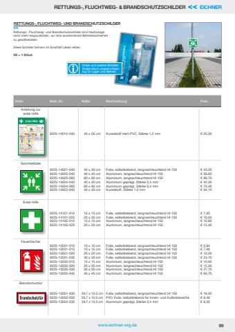 www.eichner-org.de 99PR%u00c4SENTATION UND ORGANISATIONF%u00dcR LAGER UND BETRIEBRETTUNGS-, FLUCHTWEG- & BRANDSCHUTZSCHILDER << EICHNERMotiv Best.-Nr. Ma%u00dfe Beschreibung PreisAnleitung zur erste Hilfe9225-14014-040 40 x 56 cm Kunststoff Hart-PVC, St%u00e4rke 1,2 mm %u20ac 25,30Sammelstelle9225-14021-0409225-14025-0409225-14025-0609225-14024-0409225-14024-0609225-14022-04040 x 40 cm40 x 40 cm60 x 60 cm40 x 40 cm60 x 60 cm40 x 40 cmFolie, selbstklebend, langnachleuchtend HI 150Aluminium, langnachleuchtend HI 150Aluminium, langnachleuchtend HI 150Aluminium gepr%u00e4gt, St%u00e4rke 0,4 mmAluminium gepr%u00e4gt, St%u00e4rke 0,4 mmKunststoff, St%u00e4rke 1,0 mm%u20ac 43,20%u20ac 56,60%u20ac 86,70%u20ac 42,30%u20ac 75,30%u20ac 34,10Erste Hilfe9225-14101-0159225-14101-0209225-14105-0159225-14105-02015 x 15 cm20 x 20 cm15 x 15 cm20 x 20 cmFolie, selbstklebend, langnachleuchtend HI 150Folie, selbstklebend, langnachleuchtend HI 150Aluminium, langnachleuchtend HI 150Aluminium, langnachleuchtend HI 150%u20ac 7,40 %u20ac 10,20%u20ac 10,90%u20ac 12,40Feuerl%u00f6scher9225-13031-0109225-13031-0159225-13031-0209225-13031-0309225-13035-0159225-13035-0209225-13035-0309225-13035-04510 x 10 cm15 x 15 cm20 x 20 cm30 x 30 cm15 x 15 cm20 x 20 cm30 x 30 cm45 x 45 cmFolie, selbstklebend, langnachleuchtend HI 150Folie, selbstklebend, langnachleuchtend HI 150Folie, selbstklebend, langnachleuchtend HI 150Folie, selbstklebend, langnachleuchtend HI 150Aluminium, langnachleuchtend HI 150Aluminium, langnachleuchtend HI 150Aluminium, langnachleuchtend HI 150Aluminium, langnachleuchtend HI 150%u20ac 5,94%u20ac 7,40%u20ac 10,20%u20ac 23,70%u20ac 10,90%u20ac 12,40%u20ac 27,70%u20ac 65,70Brandschutzt%u00fcr9225-13051-0309225-13050-0309225-13054-03029,7 x 10,5 cm29,7 x 10,5 cm29,7 x 10,5 cmFolie, selbstklebend, langnachleuchtend HI 150PVC-Folie, selbstklebend f%u00fcr Innen- und Au%u00dfenbereicheAluminium gepr%u00e4gt, St%u00e4rke 0,4 mm%u20ac 16,40%u20ac 6,46%u20ac 8,30Rettungs-, Fluchtweg- und Brandschutzschilder sind heutzutage nicht mehr wegzudenken, um eine ausreichende Betriebssicherheit zu gew%u00e4hrleisten.Diese Schilder k%u00f6nnen im Ernstfall Leben retten.VE = 1 St%u00fcckRETTUNGS-, FLUCHTWEG- UND BRANDSCHUTZSCHILDER>>Diese und weitere Schilder finden Sie in unserem Katalog f%u00fcr Lager und Betrieb