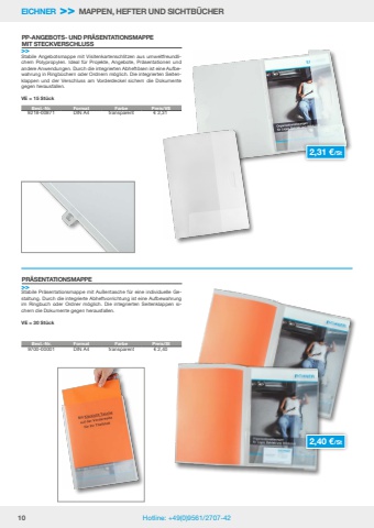 10 Hotline: +49(0)9561/2707-42EICHNER >> MAPPEN, HEFTER UND SICHTB%u00dcCHERStabile Pr%u00e4sentationsmappe mit Au%u00dfentasche f%u00fcr eine individuelle Gestaltung. Durch die integrierte Abheftvorrichtung ist eine Aufbewahrung im Ringbuch oder Ordner m%u00f6glich. Die integrierten Seitenklappen sichern die Dokumente gegen herausfallen.VE = 30 St%u00fcckStabile Angebotsmappe mit Visitenkartenschlitzen aus umweltfreundlichem Polypropylen. Ideal f%u00fcr Projekte, Angebote, Pr%u00e4sentationen und andere Anwendungen. Durch die integrierten Abheft%u00f6sen ist eine Aufbewahrung in Ringb%u00fcchern oder Ordnern m%u00f6glich. Die integrierten Seitenklappen und der Verschluss am Vorderdeckel sichern die Dokumente gegen herausfallen.VE = 15 St%u00fcckPR%u00c4SENTATIONSMAPPE>>PP-ANGEBOTS- UND PR%u00c4SENTATIONSMAPPE MIT STECKVERSCHLUSS>>Best.-Nr. Format Farbe Preis/St9700-00001 DIN A4 transparent %u20ac 2,40Best.-Nr. Format Farbe Preis/VE9218-00871 DIN A4 transparent %u20ac 2,312,31 %u20ac/St2,40 %u20ac/St