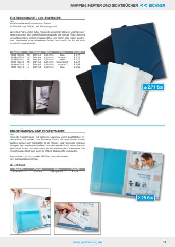 www.eichner-org.de 11MAPPEN, HEFTER UND SICHTB%u00dcCHER << EICHNERRobuste Projektmappe mit seitlichen Laschen und 2 zus%u00e4tzlichen Innentaschen f%u00fcr Vorder- und R%u00fcckseite. Durch die zus%u00e4tzlichen Innentaschen lassen sich Titelbl%u00e4tter f%u00fcr die Vorder- und R%u00fcckseite m%u00fchelos einlegen. Die unteren und %u00e4u%u00dferen Laschen werden durch einen SpezialVerschluss fixiert und verhindern ein herausfallen der Dokumente. Die Projektmappe l%u00e4sst sich auch f%u00fcr DIN A3 Dokumente verwenden.Aus stabiler 0,30 mm starker PP-Folie, dokumentenechtinkl. VisitenkartenschlitzenVE = 30 St%u00fcckIn verschiedenen Formaten und Farbenf%u00fcr DIN A4 oder DIN A3, mit EckspanngummiWenn Sie Pl%u00e4ne, Akten oder Prospekte gesch%u00fctzt ablegen und transportieren m%u00f6chten, sind diese Eckspannmappen die richtige Wahl. Sie sind umweltfreundlich, extrem strapazierf%u00e4hig und halten alles sicher zusammen. Wahlweise in verschiedenen Farben und sowohl f%u00fcr A4- als auch f%u00fcr A3-Formate erh%u00e4ltlich.PR%u00c4SENTATIONS- UND PROJEKTMAPPE>>ECKSPANNMAPPE / COLLEGEMAPPE>>ab 2,71 %u20ac/St2,75 %u20ac/StBest.-Nr. VE Format St%u00e4rke Farbe Preis/St9038-00739 10 DIN A4 0,45 mm blau %u20ac 2,719038-00740 10 DIN A4 0,45 mm schwarz %u20ac 2,719038-00741 10 DIN A4 0,45 mm wei%u00df %u20ac 2,719038-00742 10 DIN A4 0,45 mm transparent %u20ac 2,719038-00743 5 DIN A3 0,60 mm schwarz %u20ac 5,069038-00744 5 DIN A3 0,60 mm blau %u20ac 5,06Best.-Nr. Format Farbe Preis/St9700-00032 DIN A4 transparent %u20ac 2,75