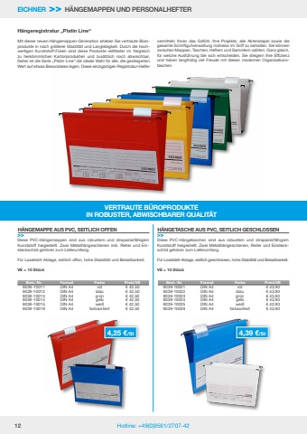 12 Hotline: +49(0)9561/2707-42EICHNER >> H%u00c4NGEMAPPEN UND PERSONALHEFTERVERTRAUTE B%u00dcROPRODUKTE IN ROBUSTER, ABWISCHBARER QUALIT%u00c4TBest.-Nr. Format Farbe Preis/VE9039-10011 DIN A4 rot %u20ac 42,509039-10012 DIN A4 blau %u20ac 42,509039-10013 DIN A4 gr%u00fcn %u20ac 42,509039-10014 DIN A4 gelb %u20ac 42,509039-10015 DIN A4 wei%u00df %u20ac 42,509039-10019 DIN A4 farbsortiert %u20ac 42,50Best.-Nr. Format Farbe Preis/VE9039-10021 DIN A4 rot %u20ac 43,909039-10022 DIN A4 blau %u20ac 43,909039-10023 DIN A4 gr%u00fcn %u20ac 43,909039-10024 DIN A4 gelb %u20ac 43,909039-10025 DIN A4 wei%u00df %u20ac 43,909039-10029 DIN A4 farbsortiert %u20ac 43,90Diese PVC-H%u00e4ngemappen sind aus robustem und strapazierf%u00e4higem Kunststoff hergestellt. Zwei Metallh%u00e4ngeschienen inkl. Reiter und Einsteckschild geh%u00f6ren zum Lieferumfang.F%u00fcr Loseblatt-Ablage, seitlich offen, hohe Stabilit%u00e4t und Belastbarkeit.VE = 10 St%u00fcckH%u00c4NGEMAPPE AUS PVC, SEITLICH OFFEN>>Diese PVC-H%u00e4ngetaschen sind aus robustem und strapazierf%u00e4higem Kunststoff hergestellt. Zwei Metallh%u00e4ngeschienen, Reiter und Einsteckschild geh%u00f6ren zum Lieferumfang.F%u00fcr Loseblatt-Ablage, seitlich geschlossen, hohe Stabilit%u00e4t und Belastbarkeit. VE = 10 St%u00fcckH%u00c4NGETASCHE AUS PVC, SEITLICH GESCHLOSSEN>>H%u00e4ngeregistratur %u201ePlatin Line%u201cMit dieser neuen H%u00e4ngemappen-Generation erleben Sie vertraute B%u00fcroprodukte in noch gr%u00f6%u00dferer Stabilit%u00e4t und Langlebigkeit. Durch die hochwertigen Kunststoff-Folien sind diese Produkte rei%u00dffester im Vergleich zu herk%u00f6mmlichen Kartonprodukten und zus%u00e4tzlich noch abwischbar. Daher ist die Serie %u201ePlatin-Line%u201c die ideale Wahl f%u00fcr alle, die gesteigerten Wert auf etwas Besonderes legen. Diese einzigartigen Registratur-Helfer vermitteln Ihnen das Gef%u00fchl, Ihre Projekte, alle Aktenstapel sowie die gesamte Schriftgutverwaltung m%u00fchelos im Griff zu behalten. Sie k%u00f6nnen zwischen Mappen, Taschen, Heftern und Sammlern w%u00e4hlen. Ganz gleich,f%u00fcr welche Ausf%u00fchrung Sie sich entscheiden, Sie steigern Ihre Effizienz und haben langfristig viel Freude mit diesen modernen Organisationstaschen.4,25 %u20ac/St 4,39 %u20ac/St