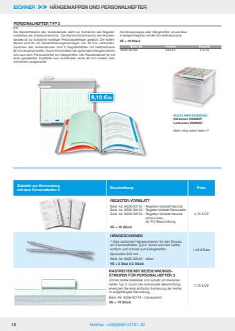 18 Hotline: +49(0)9561/2707-42Zubeh%u00f6r zur Verwendung mit dem Personalhefter 3 Beschreibung PreisREGISTER-VORBLATTBest.-Nr. 9036-00132 - Register-Vorblatt NeutralBest.-Nr. 9036-00133 - Register-Vorblatt PersonalienBest.-Nr. 9036-00134 - Register-Vorblatt Neutral ohne Linien, f%u00fcr PC-BeschriftungVE = 10 St%u00fcck4,70 %u20ac/VEH%u00c4NGESCHIENEN1 Satz optionale H%u00e4ngeschienen f%u00fcr den Einsatz am Personalhefter Typ 3. Somit wird der Hefter einfach und schnell zum H%u00e4ngehefter. Spurweite 330 mmBest.-Nr. 9605-00442 - silberVE = 5 Satz %u00e1 2 St%u00fcck1,40 %u20ac/SatzRASTREITER MIT BEZEICHNUNGSSTREIFEN F%u00dcR PERSONALHEFTER 350 mm breiter Rastreiter zum Einsatz am Personalhefter Typ 3. Durch die individuelle Beschriftung erreichen Sie eine einfache Sortierung der Hefter in aufgeh%u00e4ngter Benutzung.Best.-Nr. 9209-00179 - transparentVE = 10 St%u00fcck7,70 %u20ac/VEEICHNER >> H%u00c4NGEMAPPEN UND PERSONALHEFTERDie Klarsichttasche des Vorderdeckels dient zur Aufnahme des Registervorblattes als Inhaltsverzeichnis. Die Klarsichtinnentasche des R%u00fcckendeckels ist zur Aufnahme sonstiger Personalunterlagen gedacht. Die Au%u00dfendeckel sind f%u00fcr ein Gesamtfassungsverm%u00f6gen von 30 mm verbunden. Zwischen den Au%u00dfendeckeln sind 5 Registerbl%u00e4tter mit Heftmechanik 80 mm eingeschwei%u00dft. Durch Einschieben der optionalen H%u00e4ngeschienen wird aus dem Personalhefter ein H%u00e4ngehefter. Der R%u00fcckendeckel ist mit einer gerasterten Kopfzeile zum Aufstecken eines 50 mm breiten Vollsichtreiters ausger%u00fcstet.Als H%u00e4ngemappe oder H%u00e4ngehefter verwendbar5-teiliges Register mit 80 mm HeftmechanikVE = 10 St%u00fcckBest.-Nr. Format Preis/St9209-00769 DIN A4 %u20ac 9,10PERSONALHEFTER TYP 3>>AUCH HIER PASSEND:K%u00f6rbchen VISIMAPLeitkarten VISIMAPMehr Infos siehe Seite 179,10 %u20ac/St