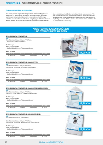 20 Hotline: +49(0)9561/2707-42EICHNER >> DOKUMENTENH%u00dcLLEN UND -TASCHENARBEITSUNTERLAGEN SCH%u00dcTZEN UND STRUKTURIERT ABLEGENDokumentenh%u00fcllen und-taschen Das umfangreiche Angebot an Ringb%u00fcchern, Ordnern, Mappen und Hefter von EICHNER erg%u00e4nzen Sie mit den praktischen Dehnfaltentaschen und Dokumentenh%u00fcllen, die in verschiedenen Ausf%u00fchrungen erh%u00e4ltlich sind. Sie k%u00f6nnen einfach mit den g%u00e4ngigen Abheftmechaniken genutzt werden. So k%u00f6nnen alle Unterlagen strukturiert abgelegt werden, sind gesch%u00fctzt und bei Bedarf schnell zur Hand. Aus robustem PVC oder umweltfreundlichem Polypropylen gefertigt, sind die Dokumententaschen und -h%u00fcllen oberfl%u00e4chlich abwischbar und %u00fcberzeugen im langfristigen Einsatz. W%u00e4hlen Sie aus den verschiedenen Modellen die f%u00fcr Sie passende Ausf%u00fchrung. Dehnfaltentasche aus 180 %u00b5m PVC-Folie, %u00d6ffnung nach oben und seitlich.Ausf%u00fchrung:%u2022 F%u00fcr Format DIN A4%u2022 Ma%u00dfe: 309 x 224 mm, F%u00fclltiefe ca. 20 mmVE = 10 St%u00fcckDehnfaltentasche aus 180 %u00b5m PVC-Folie, mit %u00d6ffnung nach oben und Halb-%u00d6ffnung seitlich.Ausf%u00fchrung:%u2022 F%u00fcr Format DIN A4%u2022 Ma%u00dfe: 309 x 224 mm, F%u00fclltiefe ca. 20 mmVE = 10 St%u00fcckDehnfaltentasche aus 180 %u00b5m PVC-Folie, halb-hoch, oben offen, mit Deckel und Abheftrand.Ausf%u00fchrung:%u2022 F%u00fcr Format DIN A4%u2022 Ma%u00dfe: 309 x 238 mm, F%u00fclltiefe ca. 20 mmVE = 10 St%u00fcckPVC-Dehnfaltentasche, volldeckendDehnfaltentasche aus 180 %u00b5m PVC-Folie, mit %u00d6ffnung nach oben, Abheftrand mit Euro-Lochung.Ausf%u00fchrung:%u2022 F%u00fcr Format DIN A4%u2022 Ma%u00dfe: 309 x 238 mm, F%u00fclltiefe ca. 20 mmVE = 10 St%u00fcckPVC-DEHNFALTENTASCHE>>PVC-DEHNFALTENTASCHE, HALBOFFEN>>PVC-DEHNFALTENTASCHE, HALBHOCH MIT DECKEL>>PVC-DEHNFALTENTASCHE, VOLLDECKEND>>Best.-Nr. Format Farbe Preis/VE9218-01054 DIN A4 transparent %u20ac 11,90Best.-Nr. Format Farbe Preis/VE9218-01068 DIN A4 transparent %u20ac 11,90Best.-Nr. Format Farbe Preis/VE9218-01055 DIN A4 transparent %u20ac 18,20Best.-Nr. Format Farbe Preis/VE9218-01061 DIN A4 transparent %u20ac 17,2011,90 %u20ac/VE 11,90 %u20ac/VE 18,20 %u20ac/VE 17,20 %u20ac/VE