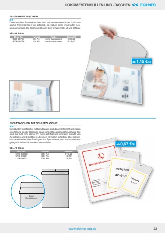 www.eichner-org.de 23DOKUMENTENH%u00dcLLEN UND -TASCHEN << EICHNERab 1,15 %u20ac/St Diese stabilen Sammeltaschen sind aus umweltfreundlicher 0,45 mm starker Polypropylen-Folie gefertigt. Sie haben einen integrierten Einsteckverschluss. Die Taschen gibt es in den Formaten DIN A4 und DIN A5.VE = 20 St%u00fcckPP-SAMMELTASCHEN>>Best.-Nr. Format Farbe Preis/VE9038-00737 DIN A4 semi-transparent %u20ac 39,809038-00738 DIN A5 semi-transparent %u20ac 23,00Best.-Nr. Format Preis/VE9218-06000 DIN A4 %u20ac 10,409218-06001 DIN A5 %u20ac 8,109218-06002 DIN A6 %u20ac 6,70Die robusten Sichttaschen mit Schutzlasche sind dokumentenecht und haben eine %u00d6ffnung an der Oberseite, sowie eine mittig geschwei%u00dfte Lochung. Sie sind aus 0,20 mm starker PP-Folie gefertigt und sind zum Schutz von Aush%u00e4ngen und Etiketten in diversen Formaten erh%u00e4ltlich. Die Schutzlasche verhindert das Eindringen von Spritzwasser und sch%u00fctzt das eingelegte Schriftst%u00fcck vor dem Herausfallen.VE = 10 St%u00fcckSICHTTASCHEN MIT SCHUTZLASCHE>>ab 0,67 %u20ac/St Detail Schutzlasche