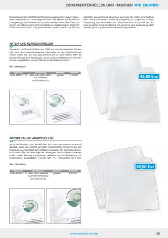 www.eichner-org.de 25DOKUMENTENH%u00dcLLEN UND -TASCHEN << EICHNERAuch die Prospekt- und Abhefth%u00fcllen sind aus biobasiertem Kunststoff gefertigt. Durch den Verzicht auf H%u00fcllen herk%u00f6mmlicher Art k%u00f6nnen Sie den Verbrauch von Kunststoff auf Erd%u00f6lbasis einsparen. Sie sind dokumentenecht, oben offen f%u00fcr die Ablage der Unterlagen, die nicht gelocht werden sollen, sowie inklusive transparenter, rei%u00dffester Lochrandverst%u00e4rkung mit Eurolochung ausgestattet. Format: DIN A4, Folienst%u00e4rke 0,10 mm.VE = 100 St%u00fcckPROSPEKT- UND ABHEFTH%u00dcLLEN>>Best.-Nr. Ausf%u00fchrung Material Preis/VE9545-00010-110 oben offen, rei%u00dffeste Lochrandverst%u00e4rlung mit Eurolochungglasklar %u20ac 52,9052,90 %u20ac/VEDie Akten- und Klarsichth%u00fcllen aus LDPE aus nachwachsendem Zuckerrohr sind eine zukunftsweisende Alternative zu den herk%u00f6mmlichen H%u00fcllen dieser Art. Sie sind dokumentenecht, an zwei Seiten offen f%u00fcr die lose Einlage Ihrer Unterlagen, sowie inklusive Griffleiste und Einrei%u00dfschutz ausgestattet. Format: DIN A4, Folienst%u00e4rke 0,10 mm.VE = 100 St%u00fcckAKTEN- UND KLARSICHTH%u00dcLLEN>>Best.-Nr. Ausf%u00fchrung Material Preis/VE9545-00001-110 oben und rechts offen, mit Griffleiste und Einrei%u00dfschutzglasklar %u20ac 43,90 43,90 %u20ac/VEDie transparenten EICHNER Sichth%u00fcllen aus Zuckerrohr sind ein besonders innovatives und nachhaltiges Produkt. Sie werden aus Bio-Kunststoff gefertigt und bestehen aus nachwachsenden Rohstoffen. Dennoch stehen sie optisch und in ihrer Handhabung herk%u00f6mmlichen Klarsichth%u00fcllen um nichts nach. Die gleichbleibend hohe Qualit%u00e4t, die Sie von EICHNER gewohnt sind, %u00fcberzeugt auch hier. Die H%u00fcllen sind %u00e4u%u00dferst rei%u00df- und durchsto%u00dffest, sowie recyclingf%u00e4hig und tragen so zu einer Einsparung von Produkten aus herk%u00f6mmlichem Kunststoff bei. Es kann zwischen einer Ausf%u00fchrung mit und ohne Euro-Lochung gew%u00e4hlt werden, je nach gew%u00fcnschtem Anwendungsbereich.