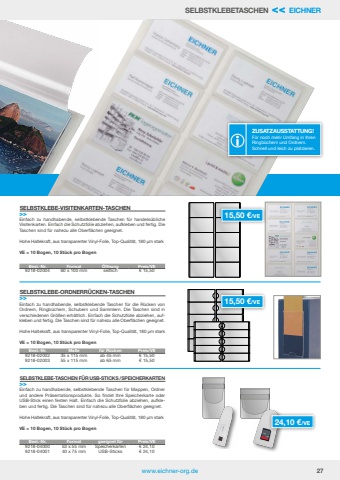 www.eichner-org.de 27SELBSTKLEBETASCHEN << EICHNEREinfach zu handhabende, selbstklebende Taschen f%u00fcr handels%u00fcbliche Visitenkarten. Einfach die Schutzfolie abziehen, aufkleben und fertig. Die Taschen sind f%u00fcr nahezu alle Oberfl%u00e4chen geeignet.Hohe Haltekraft, aus transparenter Vinyl-Folie, Top-Qualit%u00e4t, 180 %u00b5m starkVE = 10 Bogen, 10 St%u00fcck pro BogenEinfach zu handhabende, selbstklebende Taschen f%u00fcr die R%u00fccken von Ordnern, Ringb%u00fcchern, Schubern und Sammlern. Die Taschen sind in verschiedenen Gr%u00f6%u00dfen erh%u00e4ltlich. Einfach die Schutzfolie abziehen, aufkleben und fertig. Die Taschen sind f%u00fcr nahezu alle Oberfl%u00e4chen geeignet.Hohe Haltekraft, aus transparenter Vinyl-Folie, Top-Qualit%u00e4t, 180 %u00b5m starkVE = 10 Bogen, 10 St%u00fcck pro BogenEinfach zu handhabende, selbstklebende Taschen f%u00fcr Mappen, Ordner und andere Pr%u00e4sentationsprodukte. So findet Ihre Speicherkarte oder USB-Stick einen festen Halt. Einfach die Schutzfolie abziehen, aufkleben und fertig. Die Taschen sind f%u00fcr nahezu alle Oberfl%u00e4chen geeignet.Hohe Haltekraft, aus transparenter Vinyl-Folie, Top-Qualit%u00e4t, 180 %u00b5m starkVE = 10 Bogen, 10 St%u00fcck pro BogenSELBSTKLEBE-VISITENKARTEN-TASCHEN>>SELBSTKLEBE-ORDNERR%u00dcCKEN-TASCHEN>>SELBSTKLEBE-TASCHEN F%u00dcR USB-STICKS /SPEICHERKARTEN>>Best.-Nr. Format %u00d6ffnung Preis/VE9218-02004 60 x 100 mm seitlich %u20ac 15,50Best.-Nr. Ma%u00dfe f%u00fcr R%u00fccken Preis/VE9218-02002 35 x 115 mm ab 45 mm %u20ac 15,509218-02003 55 x 115 mm ab 65 mm %u20ac 15,50Best.-Nr. Format geeignet f%u00fcr Preis/VE9218-04000 53 x 55 mm Speicherkarten %u20ac 24,109218-04001 40 x 75 mm USB-Sticks %u20ac 24,1015,50 %u20ac/VE 15,50 %u20ac/VE 24,10 %u20ac/VE ZUSATZAUSSTATTUNG!F%u00fcr noch mehr Umfang in Ihren Ringb%u00fcchern und Ordnern. Schnell und leich zu platzieren.