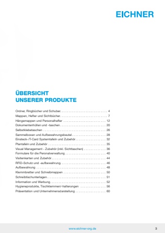 %u00dcBERSICHTUNSERER PRODUKTEOrdner, Ringb%u00fccher und Schuber . . . . . . . . . . . . . . . . . . . . . . . . . . . . 4 Mappen, Hefter und Sichtb%u00fccher . . . . . . . . . . . . . . . . . . . . . . . . . . . . 7H%u00e4ngemappen und Personalhefter . . . . . . . . . . . . . . . . . . . . . . . . . . 12Dokumentenh%u00fcllen und -taschen . . . . . . . . . . . . . . . . . . . . . . . . . . . 20Selbstklebetaschen . . . . . . . . . . . . . . . . . . . . . . . . . . . . . . . . . . . . . . 26Sammelboxen und Aufbewahrungsbeutel . . . . . . . . . . . . . . . . . . . . 28Einsteck-/T-Card Systemtafeln und Zubeh%u00f6r . . . . . . . . . . . . . . . . . . 32Plantafeln und Zubeh%u00f6r . . . . . . . . . . . . . . . . . . . . . . . . . . . . . . . . . . . 35Visual Management - Zubeh%u00f6r (inkl. Sichttaschen) . . . . . . . . . . . . . . 36Formulare f%u00fcr die Peronalverwaltung . . . . . . . . . . . . . . . . . . . . . . . . 40Visitenkarten und Zubeh%u00f6r . . . . . . . . . . . . . . . . . . . . . . . . . . . . . . . . 44RFID-Schutz und -aufbewahrung . . . . . . . . . . . . . . . . . . . . . . . . . . . 46Aufbewahrung . . . . . . . . . . . . . . . . . . . . . . . . . . . . . . . . . . . . . . . . . . 48Klemmbretter und Schreibmappen . . . . . . . . . . . . . . . . . . . . . . . . . . 50Schreibtischunterlagen . . . . . . . . . . . . . . . . . . . . . . . . . . . . . . . . . . . 51Information und Werbung . . . . . . . . . . . . . . . . . . . . . . . . . . . . . . . . . 52Hygieneprodukte, Tischklemmen/-halterungen . . . . . . . . . . . . . . . . 56Pr%u00e4sentation und Unternehmensdarstellung . . . . . . . . . . . . . . . . . . . 60www.eichner-org.de 3