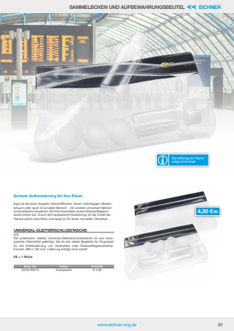 www.eichner-org.de 31SAMMELBOXEN UND AUFBEWAHRUNGSBEUTEL << EICHNERSichere Aufbewahrung f%u00fcr Ihre ReiseEgal ob bei einer l%u00e4ngeren Gesch%u00e4ftsreise, einem mehrt%u00e4gigen Messebesuch oder auch im privaten Bereich - mit unserer Universal-Gleitverschlusstasche bewahren Sie Ihre Kosmetika sowie K%u00f6rperpflegeprodukte sicher auf. Durch die transparente Ausf%u00fchrung ist der Inhalt der Tasche sofort ersichtlich und sorgt so f%u00fcr einen schnellen %u00dcberblick.Die praktische, stabile Universal-Gleitverschlusstasche ist aus transparenter Weichfolie gefertigt. Sie ist der ideale Begleiter f%u00fcr Flugreisen f%u00fcr die Aufbewahrung von Kosmetika oder K%u00f6rperpflegeprodukten. Format: 290 x 150 mm, Lieferung erfolgt ohne Inhalt!VE = 1 St%u00fcckUNIVERSAL-GLEITVERSCHLUSSTASCHE>>Best.-Nr. Farbe Preis/St9218-02513 transparent %u20ac 4,304,30 %u20ac/StDie Lieferung der Tasche erfolgt ohne Inhalt.