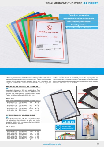 www.eichner-org.de 37MAGNETISCHE INFOTASCHE PREMIUM>>Magnetische Infotaschen DIN A4, aus blendfreier Folie, mit haftstarken Magnet-Streifen inklusive Polsterschaum an allen vier Seiten best%u00fcckt, F%u00fclltiefe 3 mm, diverse Farben erh%u00e4ltlich. Au%u00dfenma%u00dfe 225 x 312 mm. VE = 5 St%u00fcckBest.-Nr. Format Farbe Preis/St9015-00593-010 DIN A4 hoch blau %u20ac 8,609015-00593-020 DIN A4 hoch rot %u20ac 8,609015-00593-030 DIN A4 hoch gr%u00fcn %u20ac 8,609015-00593-040 DIN A4 hoch gelb %u20ac 8,609015-00593-060 DIN A4 hoch orange %u20ac 8,609015-00593-140 DIN A4 hoch grau %u20ac 8,60MAGNETISCHE INFOTASCHE BASIC>>Magnetische Infotaschen DIN A4, aus blendfreier Folie, mit haftstarken Magnet-Streifen an allen vier Seiten best%u00fcckt, F%u00fclltiefe 1,5 mm, diverse Farben erh%u00e4ltlich. Au%u00dfenma%u00dfe 240 x 330 mm.VE = 5 St%u00fcckBest.-Nr. Format Farbe Preis/St9015-00594-010 DIN A4 hoch blau %u20ac 5,359015-00594-020 DIN A4 hoch rot %u20ac 5,359015-00594-030 DIN A4 hoch gr%u00fcn %u20ac 5,359015-00594-040 DIN A4 hoch gelb %u20ac 5,359015-00594-060 DIN A4 hoch orange %u20ac 5,359015-00594-140 DIN A4 hoch grau %u20ac 5,35Einfach zu verwendenBlendfreie Folie f%u00fcr bessere SichtR%u00fcckseite magnethaftendEinseitig nutzbarIn zwei Varianten erh%u00e4ltlichVISUAL MANAGEMENT - ZUBEH%u00d6R << EICHNERMit den magnetischen EICHNER-Infotaschen und Magnetrahmen pr%u00e4sentierenSie Ihre Informationen auff%u00e4llig und %u00fcbersichtlich. Der Inhalt ist mit einemHandgriff schnell ausgewechselt. L%u00e4stiges Suchen und Nachkaufen von Magneten, umst%u00e4ndliches Entfernen von Kleberesten oder die %u00e4rgerlichen Einstiche von Pinn-Nadeln in der Wand geh%u00f6ren der Vergangenheit an. Die magnetischen Infotaschen haften auf allen eisenhaltigen Metalloberfl%u00e4chen. Sie sind als beidseitig lesbarer Rahmen oder als einseitig nutzbare Infotasche in diversen Farben erh%u00e4ltlich.ab 5,35 %u20ac/St Magnethaftend an allen vier Seiten!1,5 mm F%u00fcllh%u00f6he3 mm F%u00fcllh%u00f6he