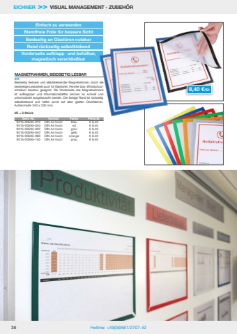 38 Hotline: +49(0)9561/2707-42EICHNER >> VISUAL MANAGEMENT - ZUBEH%u00d6REinfach zu verwendenBlendfreie Folie f%u00fcr bessere SichtBeidseitig an Glast%u00fcren nutzbarRand r%u00fcckseitig selbstklebendVorderseite aufklapp- und bef%u00fcllbar,magnetisch verschlie%u00dfbarMAGNETRAHMEN, BEIDSEITIG LESBAR>>Beidseitig lesbarer und selbstklebender Magnetrahmen, durch die beidseitige Lesbarkeit auch f%u00fcr Glast%u00fcren, Fenster bzw. Windschutzscheiben bestens geeignet. Die Vorderseite des Magnetrahmens ist aufklappbar und Informationsbl%u00e4tter k%u00f6nnen so schnell und unkompliziert ausgetauscht werden. Der farbige Rand ist r%u00fcckseitig selbstklebend und haftet somit auf allen glatten Oberfl%u00e4chen. Au%u00dfenma%u00dfe 240 x 330 mm.VE = 5 St%u00fcckBest.-Nr. Format Farbe Preis/St9015-00595-010 DIN A4 hoch blau %u20ac 8,409015-00595-020 DIN A4 hoch rot %u20ac 8,409015-00595-030 DIN A4 hoch gr%u00fcn %u20ac 8,409015-00595-040 DIN A4 hoch gelb %u20ac 8,409015-00595-060 DIN A4 hoch orange %u20ac 8,409015-00595-140 DIN A4 hoch grau %u20ac 8,408,40 %u20ac/St