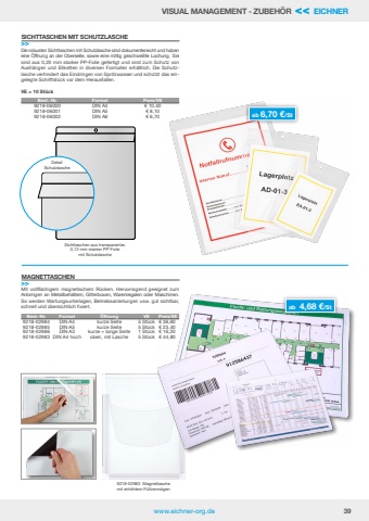 www.eichner-org.de 39VISUAL MANAGEMENT - ZUBEH%u00d6R << EICHNERMit vollfl%u00e4chigem magnetischem R%u00fccken. Hervorragend geeignet zum Anbringen an Metallbeh%u00e4ltern, Gitterboxen, Warenregalen oder Maschinen. So werden Wartungsunterlagen, Betriebsanleitungen usw. gut sichtbar, schnell und %u00fcbersichtlich fixiert.MAGNETTASCHEN>>ab 6,70 %u20ac/St Best.-Nr. Format Preis/VE9218-06000 DIN A4 %u20ac 10,409218-06001 DIN A5 %u20ac 8,109218-06002 DIN A6 %u20ac 6,70Die robusten Sichttaschen mit Schutzlasche sind dokumentenecht und haben eine %u00d6ffnung an der Oberseite, sowie eine mittig geschwei%u00dfte Lochung. Sie sind aus 0,20 mm starker PP-Folie gefertigt und sind zum Schutz von Aush%u00e4ngen und Etiketten in diversen Formaten erh%u00e4ltlich. Die Schutzlasche verhindert das Eindringen von Spritzwasser und sch%u00fctzt das eingelegte Schriftst%u00fcck vor dem Herausfallen.VE = 10 St%u00fcckSICHTTASCHEN MIT SCHUTZLASCHE>>Sichttaschen aus transparenter, 0,12 mm starker PP-Foliemit SchutzlascheDetail Schutzlascheab 4,68 %u20ac/St Best.-Nr. Format %u00d6ffnung VE Preis/VE9218-02984 DIN A4 kurze Seite 5 St%u00fcck %u20ac 36,609218-02985 DIN A5 kurze Seite 5 St%u00fcck %u20ac 23,409218-02986 DIN A3 kurze + lange Seite 1 St%u00fcck %u20ac 16,209218-02983 DIN A4 hoch oben, mit Lasche 5 St%u00fcck %u20ac 44,809218-02983 Magnettasche mit erh%u00f6htem F%u00fcllverm%u00f6gen