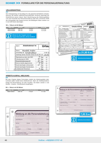 40 Hotline: +49(0)9561/2707-42EICHNER >> FORMULARE F%u00dcR DIE PERSONALVERWALTUNGMit dem Original dieses Formulares meldet der Abteilungsleiter dem Lohnb%u00fcro jeden Ausfall eines Arbeitnehmers. Nach der Arbeitsaufnahme erfolgt die R%u00fcckmeldung mit dem Duplikat. Die Daten werden in die Arbeits-, Urlaubs-, Krankenkarte eingetragen. VE = 1 Block mit 50 S%u00e4tzenARBEITS-AUSFALL-MELDUNG>>Best.-Nr. Format selbstdurchschreibend Preis/VE9606-00551 DIN A5 2-fach %u20ac 7,507,50 %u20ac/VEselbstdurchschreibendDer Urlaubsantrag ist Grundlage f%u00fcr die gesamte betriebliche Urlaubsplanung. Mit diesem selbstdurchschreibenden Vordruck beantragt der Arbeitnehmer seinen Urlaub. Nach Genehmigung des Abteilungsleiters und nach Kontrolle der Personalverwaltung oder des Lohnb%u00fcros erh%u00e4lt der Antragsteller das Original zur%u00fcck; die best%u00e4tigten Daten werden nun in die AUK-Karte %u00fcbertragen.VE = 1 Block mit 50 S%u00e4tzenURLAUBSANTRAG>>Best.-Nr. Format selbstdurchschreibend Preis/VE9606-00550 DIN A5 2-fach %u20ac 21,509606-00586 DIN A5 3-fach %u20ac 27,60ab 21,50 %u20ac/VEBl%u00f6cke f%u00fcr das Folgejahr sind abAugust des laufenden Jahres erh%u00e4ltlich!selbstdurchschreibend