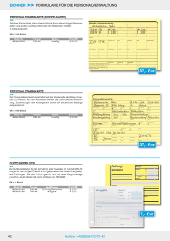 42 Hotline: +49(0)9561/2707-42EICHNER >> FORMULARE F%u00dcR DIE PERSONALVERWALTUNGBest.-Nr. Format Seiten Preis/VE9606-00562 DIN A4 4-seitig %u20ac 87,00Best.-Nr. Format Seiten Preis/VE9606-00563 DIN A5 2-seitig %u20ac 37,00Teil einer Stammdatei, die in %u00fcbersichtlicher Form alle wichtigen Personaldaten und andere wichtige Merkmale der Mitarbeiter enth%u00e4lt.4-seitig bedruckt.VE = 100 St%u00fcckPERSONALSTAMMKARTE (DOPPELKARTE)>>Die Personalstammkarte beinhaltet auf der Vorderseite s%u00e4mtliche Angaben zur Person. Auf der R%u00fcckseite werden die Lohn-Gehalts-Entwicklung, Zuwendungen des Arbeitgebers sowie die steuerlichen Belange aufgezeichnet.VE = 100 St%u00fcckPERSONALSTAMMKARTE>>87,- %u20ac/VE37,- %u20ac/VEDie Quittungsbl%u00f6cke f%u00fcr die Einnahme oder Ausgabe im Format DIN A6 sorgen f%u00fcr den n%u00f6tigen %u00dcberblick und geben einen Nachweis %u00fcber geleistete Zahlungen. Sie sind 2-fach gelocht und mit einer Pappunterlage versehen. Jeder Block hat einen Umfang von 100 Blatt.VE = 1 BlockQUITTUNGSBLOCK>>Best.-Nr. Format Ausf%u00fchrung Preis/VE9606-00185 DIN A6 Quittung/Einnahme %u20ac 7,009606-00186 DIN A6 Ausgabe %u20ac 7,00Best.-Nr. 9606-00185 EICHNER Organisation GmbH & Co. KG, Postfach 1538, 96405 CoburgQuittung/EinnahmeEndbetrag%u2013 % SkontoGesamtbetrag+ VorsteuerNettowertBeleg Nr.EUREUREUREUREUREUR in Worten (brutto)Konto Lastschrift BuchungsvermerkEmpfangsbest%u00e4tigung, denUnterschriftZahlung vonf%u00fcr9606-00185.indd 1 04.10.2018 11:26:397,- %u20ac/VE