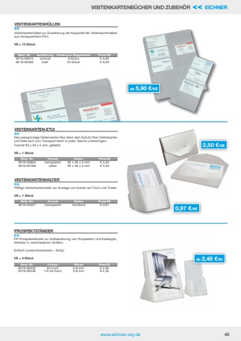 www.eichner-org.de 45PP-Prospektst%u00e4nder zur Aufbewahrung von Prospekten und Katalogen, lieferbar in verschiedenen Gr%u00f6%u00dfen.Einfach zusammenstecken - fertig!VE = 5 St%u00fcckPROSPEKTST%u00c4NDER>>Best.-Nr. Format St%u00e4rke Preis/St9219-00223 A4 hoch 0,8 mm %u20ac 3,959219-00226 1/3 A4 hoch 0,8 mm %u20ac 2,45Best.-Nr. Ausf%u00fchrung Karten pro Doppelseite Preis/VE9218-00915 schmal 8 St%u00fcck %u20ac 5,909218-02009 breit 20 St%u00fcck %u20ac 8,30Best.-Nr. Format Seiten Preis/St9218-00804 transparent 93 x 59 x 5 mm %u20ac 2,509219-00188 silber 93 x 59 x 5 mm %u20ac 2,50Best.-Nr. Format Seiten Preis/VE9219-00227 transparent hochkant %u20ac 0,97Visitenkartenh%u00fcllen zur Erweiterung der Kapazit%u00e4t der Visitenkartenalben aus transparentem PVC.VE = 10 St%u00fcckVISITENKARTENH%u00dcLLEN>>Das preisg%u00fcnstige Visitenkarten-Etui dient dem Schutz Ihrer Visitenkarten und l%u00e4sst sich zum Transport leicht in jeder Tasche unterbringen. Format 93 x 59 x 5 mm, gefaltet.VE = 1 St%u00fcckPfiffige Visitenkartenhalter zur Auslage von Karten auf Tisch und Theke.VE = 1 St%u00fcckVISITENKARTEN-ETUI>>VISITENKARTENHALTER>>VISITENKARTENB%u00dcCHER UND ZUBEH%u00d6R << EICHNERab 2,45 %u20ac/St0,97 %u20ac/VEab 5,90 %u20ac/VE2,50 %u20ac/VE