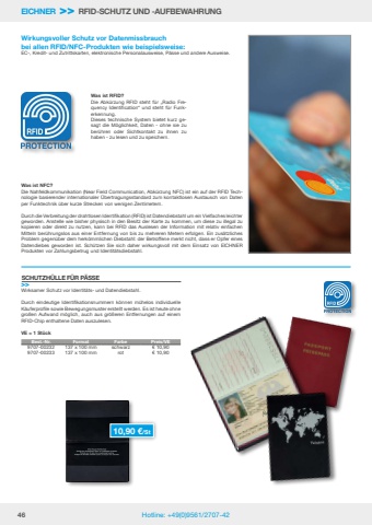 46 Hotline: +49(0)9561/2707-42Best.-Nr. Format Farbe Preis/VE9707-00232 137 x 100 mm schwarz %u20ac 10,909707-00233 137 x 100 mm rot %u20ac 10,90Wirksamer Schutz vor Identit%u00e4ts- und Datendiebstahl.Durch eindeutige Identifikationsnummern k%u00f6nnen m%u00fchelos individuelle K%u00e4uferprofile sowie Bewegungsmuster erstellt werden. Es ist heute ohne gro%u00dfen Aufwand m%u00f6glich, auch aus gr%u00f6%u00dferen Entfernungen auf einem RFID-Chip enthaltene Daten auszulesen.VE = 1 St%u00fcckSCHUTZH%u00dcLLE F%u00dcR P%u00c4SSE>>Wirkungsvoller Schutz vor Datenmissbrauch bei allen RFID/NFC-Produkten wie beispielsweise:EC-, Kredit- und Zutrittskarten, elektronische Personalausweise, P%u00e4sse und andere Ausweise.Was ist NFC?Die Nahfeldkommunikation (Near Field Communication, Abk%u00fcrzung NFC) ist ein auf der RFID Technologie basierender internationaler %u00dcbertragungsstandard zum kontaktlosen Austausch von Daten per Funktechnik %u00fcber kurze Strecken von wenigen Zentimetern. Durch die Verbreitung der drahtlosen Identifikation (RFID) ist Datendiebstahl um ein Vielfaches leichter geworden. Anstelle wie bisher physisch in den Besitz der Karte zu kommen, um diese zu illegal zu kopieren oder direkt zu nutzen, kann bei RFID das Auslesen der Information mit relativ einfachen Mitteln ber%u00fchrungslos aus einer Entfernung von bis zu mehreren Metern erfolgen. Ein zus%u00e4tzliches Problem gegen%u00fcber dem herk%u00f6mmlichen Diebstahl: der Betroffene merkt nicht, dass er Opfer eines Datendiebes geworden ist. Sch%u00fctzen Sie sich daher wirkungsvoll mit dem Einsatz von EICHNER Produkten vor Zahlungsbetrug und Identit%u00e4tsdiebstahl.Was ist RFID?Die Abk%u00fcrzung RFID steht f%u00fcr %u201eRadio Frequency Identification%u201c und steht f%u00fcr Funkerkennung. Dieses technische System bietet kurz gesagt die M%u00f6glichkeit, Daten - ohne sie zu ber%u00fchren oder Sichtkontakt zu ihnen zu haben - zu lesen und zu speichern.EICHNER >> RFID-SCHUTZ UND -AUFBEWAHRUNG10,90 %u20ac/St