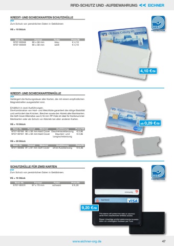 www.eichner-org.de 47Verl%u00e4ngert die Nutzungsdauer aller Karten, die mit einem empfindlichenMagnetstreifen ausgestattet sind.Erh%u00e4ltlich in zwei Ausf%u00fchrungen. Die Kombination von Hart- und Weichfolie garantiert die n%u00f6tige Stabilit%u00e4tund verhindert das Knicken, Brechen sowie den Abrieb aller Bankkarten.Die Soft-Cover-Alternative aus 0,16 mm PP-Folie ist ideal f%u00fcr KontonummerMerkkarten oder als Schutz vor Abbrieb bei allen anderen Karten.VE = 10 St%u00fcckVE = 30 St%u00fcckZum Schutz von pers%u00f6nlichen Daten in Geldb%u00f6rsen.VE = 10 St%u00fcckSCHUTZH%u00dcLLE F%u00dcR ZWEI KARTEN>>Best.-Nr. Format Farbe Preis/St9707-00231 97 x 70 mm schwarz %u20ac 9,20Best.-Nr. Format Farbe Preis/St9707-00048 90 x 58 mm blau %u20ac 4,109707-00049 90 x 58 mm wei%u00df %u20ac 4,10Best.-Nr. Format Material Ausf%u00fchrung Preis/VE9707-00160 90 x 59 mmHard Cover Daumenausstanzung %u20ac 2,859707-00161 90 x 59 mmHard Cover Daumen- und Langlochstanzung%u20ac 2,85Best.-Nr. Format Material Ausf%u00fchrung Preis/St9701-00006 91 x 61 mm Soft Cover ohne Ausstanzung %u20ac 0,36Zum Schutz von pers%u00f6nlichen Daten in Geldb%u00f6rsenVE = 10 St%u00fcckKREDIT- UND SCHECKKARTEN SCHUTZH%u00dcLLE>>KREDIT- UND SCHECKKARTENH%u00dcLLE>>RFID-SCHUTZ UND -AUFBEWAHRUNG << EICHNERab 0,29 %u20ac/St9,20 %u20ac/St4,10 %u20ac/St
