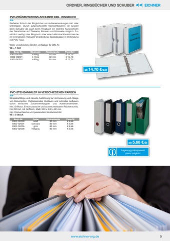ab 14,70 %u20ac/Setab 5,66 %u20ac/Stwww.eichner-org.de 5ORDNER, RINGB%u00dcCHER UND SCHUBER << EICHNERBest.-Nr. Mechanik R%u00fcckenbreite Preis/Set9302-00200 4-Ring 40 mm %u20ac 14,709302-00201 4-Ring 60 mm %u20ac 15,709302-00202 4-Ring 80 mm %u20ac 17,70Perfekter Schutz der Ringb%u00fccher vor Au%u00dfeneinwirkungen inkl. aller Unterlagen. Durch aufgeschwei%u00dfte Klarsichttaschen ist sowohl beim Schuber als auch beim Ringbuch ein leichtes Auswechseln der Deckbl%u00e4tter auf Titelseite, R%u00fccken und R%u00fcckseite m%u00f6glich. Zus%u00e4tzlich verf%u00fcgt das Ringbuch %u00fcber eine halbhohe Klarsichttasche im Innendeckel. Robuste Verarbeitung: Spezialpappe in Verbindung mit PVC-Folie.Wei%u00df, verschiedene Breiten verf%u00fcgbar, f%u00fcr DIN A4VE = 1 SetPVC-PR%u00c4SENTATIONS-SCHUBER INKL. RINGBUCH>>Best.-Nr. Farbe R%u00fcckenbreite Preis/St9302-02000 wei%u00df 80 mm %u20ac 5,669302-02001 schwarz 80 mm %u20ac 5,669302-02005 gr%u00fcn 80 mm %u20ac 5,669302-02006 hellgrau 80 mm %u20ac 5,66Strapazierf%u00e4hige und robuste Ausf%u00fchrung zur Archivierung und Ablage von Dokumenten. Platzsparendes Verstauen und schnelles Aufbauen durch einfaches Zusammenklappen und Auseinanderfalten. Inkl. Griffloch, Einschubtasche und auswechselbarem R%u00fcckenschild. F%u00fcr DIN A4, mit Griffloch, Ma%u00df: 320 x 240 x 80 mminkl. R%u00fcckentasche und passendem EinsteckschildVE = 5 St%u00fcckPVC-STEHSAMMLER IN VERSCHIEDENEN FARBEN>>Lagerung platzsparend plano m%u00f6glich!
