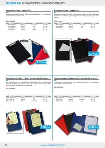 50 Hotline: +49(0)9561/2707-42Best.-Nr. Format Farbe Preis/VE9015-00670 DIN A4 blau %u20ac 5,309015-00671 DIN A4 rot %u20ac 5,309015-00672 DIN A4 schwarz %u20ac 5,30Best.-Nr. Format Farbe Preis/St9015-00468 DIN A4 schwarz %u20ac 3,009015-00469 DIN A4 rot %u20ac 3,009015-00470 DIN A4 blau %u20ac 3,009015-00477 DIN A4 wei%u00df %u20ac 3,00Best.-Nr. Format Farbe Preis/VE9015-00472 DIN A4 blau %u20ac 4,809015-00473 DIN A4 schwarz %u20ac 4,809015-00471 DIN A4 rot %u20ac 4,80Best.-Nr. Format Farbe Preis/St9015-00533 DIN A4 schwarz %u20ac 3,249015-00534 DIN A4 rot %u20ac 3,249015-00535 DIN A4 blau %u20ac 3,24Mit transparenter und vollfl%u00e4chiger Schutzfolie auf der Vorderseite. Robuste Ausf%u00fchrung, ideal f%u00fcr Lager und Logistik. Fixierung der Klarsichtfolie durch seitlichen Klettverschluss.VE = 10 St%u00fcckHochwertige Ausf%u00fchrung mit extra starkem Pappkern und langlebiger, vernickelter Klemmmechanik.VE = 12 St%u00fcckHochwertige Ausf%u00fchrung mit extra starkem Pappkern und langlebiger vernickelter Klemmmechanik.VE = 12 St%u00fcckHochwertige Ausf%u00fchrung mit transparenter Tasche auf der Vorderseite, R%u00fcckseite mit farblich angepasster gro%u00dfer Tasche zum sammeln von losen Bl%u00e4ttern.VE = 5 St%u00fcckKLEMMBRETT %u201eEASY OPEN%u201c MIT KLEMMMECHANIK>>KLEMMBRETT MIT HAKEN%u00d6SE>>SCHREIBMAPPE MIT HAKEN%u00d6SE UND INNENTASCHE>>KLEMMBRETT MIT HAKEN%u00d6SE>>EICHNER >> KLEMMBRETTER UND SCHREIBMAPPEN3,00 %u20ac/St5,30 %u20ac/St 4,80 %u20ac/St3,24 %u20ac/St
