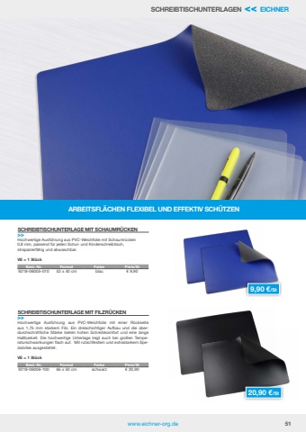 www.eichner-org.de 51Best.-Nr. Format Farbe Preis/St9218-06005-010 53 x 40 cm blau %u20ac 9,90Best.-Nr. Format Farbe Preis/St9218-06006-100 65 x 50 cm schwarz %u20ac 20,90Hochwertige Ausf%u00fchrung aus PVC-Weichfolie mit Schaumr%u00fccken0,8 mm, passend f%u00fcr jeden Schul- und Kinderschreibtisch, strapazierf%u00e4hig und abwaschbar.VE = 1 St%u00fcckHochwertige Ausf%u00fchrung aus PVC-Weichfolie mit einer R%u00fcckseite aus 1,75 mm starkem Filz. Ein dreischichtiger Aufbau und die %u00fcberdurchschnittliche St%u00e4rke bieten hohen Schreibkomfort und eine lange Haltbarkeit. Die hochwertige Unterlage liegt auch bei gro%u00dfen Temperaturschwankungen flach auf. Mit rutschfestem und extrastarkem Spezialvlies ausgestattet. VE = 1 St%u00fcckSCHREIBTISCHUNTERLAGE MIT SCHAUMR%u00dcCKEN>>SCHREIBTISCHUNTERLAGE MIT FILZR%u00dcCKEN>>SCHREIBTISCHUNTERLAGEN << EICHNERARBEITSFL%u00c4CHEN FLEXIBEL UND EFFEKTIV SCH%u00dcTZEN9,90 %u20ac/St20,90 %u20ac/St