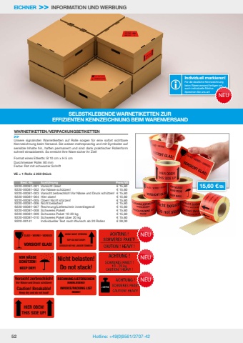 52 Hotline: +49(0)9561/2707-42EICHNER >> INFORMATION UND WERBUNGUnsere signalroten Warnetiketten auf Rolle sorgen f%u00fcr eine sofort sichtbare Kennzeichnung beim Versand. Sie weisen mehrsprachig und mit Symbolen auf sensible Inhalte hin, haften permanent und sind dank praktischer Rollenform schnell einsatzbereit. So erreicht Ihre Ware sicher ihr Ziel!Format eines Etiketts: B 10 cm x H 5 cmDurchmesser Rolle: 80 mmFarbe: Rot mit schwarzer SchriftVE = 1 Rolle %u00e1 250 St%u00fcckWARNETIKETTEN/VERPACKUNGSETIKETTEN>>GLAS! %u2022 VERRE! %u2022 VIDRIOS!VORSICHT GLAS!VOR N%u00c4SSE SCH%u00dcTZEN!KEEP DRY!HIER OBEN!THIS SIDE UP!OBEN! NICHT ST%u00dcRZEN!TOP! DO NOT DROP!DESSUS! NE PAS LAISSER TOMBER!Nicht belasten!Do not stack!RECHNUNG/LIEFERSCHEININNENLIEGEND!INVOICE/PACKING LISTINSIDE!Vorsicht zerbrechlich!Vor N%u00e4sse und Druck sch%u00fctzen!Caution! Breakable!Keep dry and do not load!15,60 %u20ac/St NEUNEUNEUSELBSTKLEBENDE WARNETIKETTEN ZUREFFIZIENTEN KENNZEICHNUNG BEIM WARENVERSANDBest.-Nr. Ausf%u00fchrung Preis/VE9220-00081-001 Vorsicht Glas! %u20ac 15,609220-00081-002 Vor N%u00e4sse sch%u00fctzen! %u20ac 15,609220-00081-003 Vorsicht zerbrechlich! Vor N%u00e4sse und Druck sch%u00fctzen! %u20ac 15,609220-00081-004 Hier oben! %u20ac 15,609220-00081-005 Oben! Nicht st%u00fcrzen! %u20ac 15,609220-00081-006 Nicht belasten! %u20ac 15,609220-00081-007 Rechnung/Lieferschein innenliegend! %u20ac 15,609220-00081-008 Schweres Paket! %u20ac 15,609220-00081-009 Schweres Paket 10-20 kg %u20ac 15,609220-00081-010 Schweres Paket %u00fcber 20 kg %u20ac 15,609220-00141 Individueller Text nach Wunsch ab 20 Rollen %u20ac 28,00Individuell markieren!F%u00fcr die deutliche Kennzeichnung beim Warenversand fertigen wir auch individuelle Motive.Sprechen Sie uns an!NEU