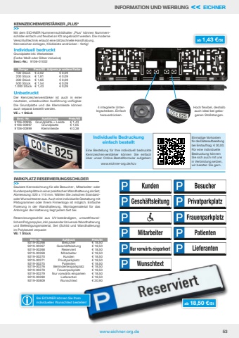 www.eichner-org.de 53INFORMATION UND WERBUNG << EICHNERSaubere Kennzeichnung f%u00fcr alle Besucher-, Mitarbeiter- oder Kundenparkpl%u00e4tze in einer praktischen Wandhalterung als Set; Abmessung: 520 x 110 mm. W%u00e4hlen Sie zwischen Standardoder Wunschtexten aus. Auch eine individuelle Gestaltung mit Piktogrammen oder Ihrem Firmenlogo ist m%u00f6glich. Einfache Fixierung in der Wandhalterung. Montagematerial f%u00fcr das Anbringen der Halterung liegt jedem Set bei.Reservierungsschild aus UV-best%u00e4ndigem, umweltfreundlichem Polypropylen, inkl. passender Universal-Wandhalterung und Befestigungsmaterial, Set (Schild und Wandhalterung) im Polybeutel verpacktVE: 1 St%u00fcckab 18,50 %u20ac/St PARKPLATZ RESERVIERUNGSSCHILDER>>Bei EICHNER k%u00f6nnen Sie Ihrenindividuellen Wunschtext bestellen!Best.-Nr. Aufdruck Preis/St9219-00266 Besucher %u20ac 18,509219-00267 Gesch%u00e4ftsleitung %u20ac 18,509219-00268 Reserviert %u20ac 18,509219-00269 Mitarbeiter %u20ac 18,509219-00270 Kunden %u20ac 18,509219-00271 Privatparkplatz %u20ac 18,509219-00275 Patienten %u20ac 18,509219-00276 Behindertenparkplatz %u20ac 18,509219-00278 Frauenparkplatz %u20ac 18,509219-00279 Nur vorw%u00e4rts einparken %u20ac 18,509219-00280 Lieferanten %u20ac 18,509219-00809 Wunschtext %u20ac 20,90Individuelle Bedruckungeinfach bestelltEine Bestellung f%u00fcr Ihre individuell bedruckte Kennzeichenverst%u00e4rker k%u00f6nnen Sie einfach %u00fcber unser Online-Bestellformular aufgeben:www.eichner-org.de/kzvEinmalige Vorkosten f%u00fcr die Datenaufbereitung bei Erstauftrag: %u20ac 30,00.F%u00fcr eine individuelle Bedruckung k%u00f6nnen Sie sich auch mit uns in Verbindung setzen, wir beraten Sie gern.Hoch flexibel, deshalb auch ideal bei gebogenen Sto%u00dfstangen.4 integrierte Unterlegscheiben. Einfach herausdr%u00fccken.ab 1,43 %u20ac/St Menge Preis/St Aufpreis je weitere Farbe100 St%u00fcck %u20ac 2,02 %u20ac 0,09200 St%u00fcck %u20ac 1,81 %u20ac 0,09300 St%u00fcck %u20ac 1,65 %u20ac 0,09500 St%u00fcck %u20ac 1,54 %u20ac 0,091.000 St%u00fcck %u20ac 1,43 %u20ac 0,09Best.-Nr. Ausf%u00fchrung Preis/VE9106-00995 Grundplatte + Leiste %u20ac 1,439106-00997 Grundplatte %u20ac 1,059106-00999 Klemmleiste %u20ac 0,38Mit dem EICHNER Nummernschildhalter %u201ePlus%u201c k%u00f6nnen Nummernschilder einfach und flexibel an Kfz angebracht werden. Die moderne Verschlu%u00dftechnik erlaubt eine blitzschnelle Handhabung. Kennzeichen einlegen, Klickleiste andr%u00fccken - fertig!KENNZEICHENVERST%u00c4RKER %u201ePLUS%u201c>>Grundplatte inkl. Werbeleiste(Farbe Wei%u00df oder Silber inklusive)Best.-Nr.: 9106-01002Der Kennzeichenverst%u00e4rker ist auch in einer neutralen, unbedruckten Ausf%u00fchrung verf%u00fcgbar. Die Grundplatte und die Klemmleiste k%u00f6nnen auch separat bestellt werden. VE = 1 St%u00fcckIndividuell bedrucktUnbedruckt